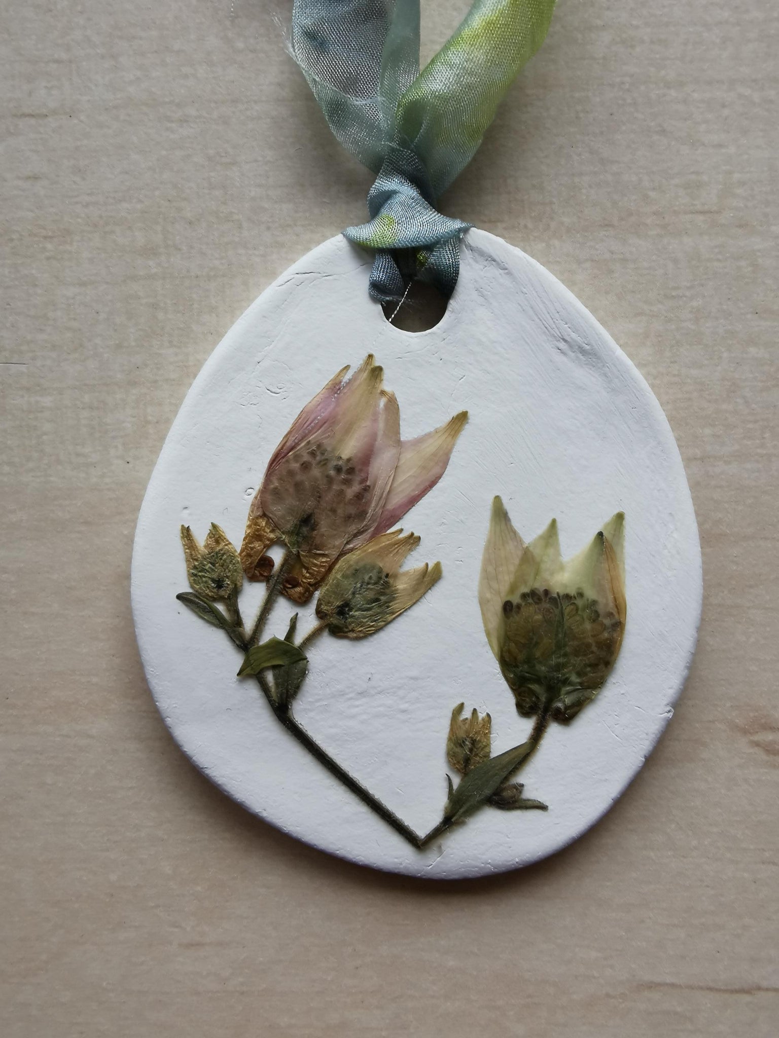 Et unikt lille ophæng i hvidt ler med en fin presset blomst.
