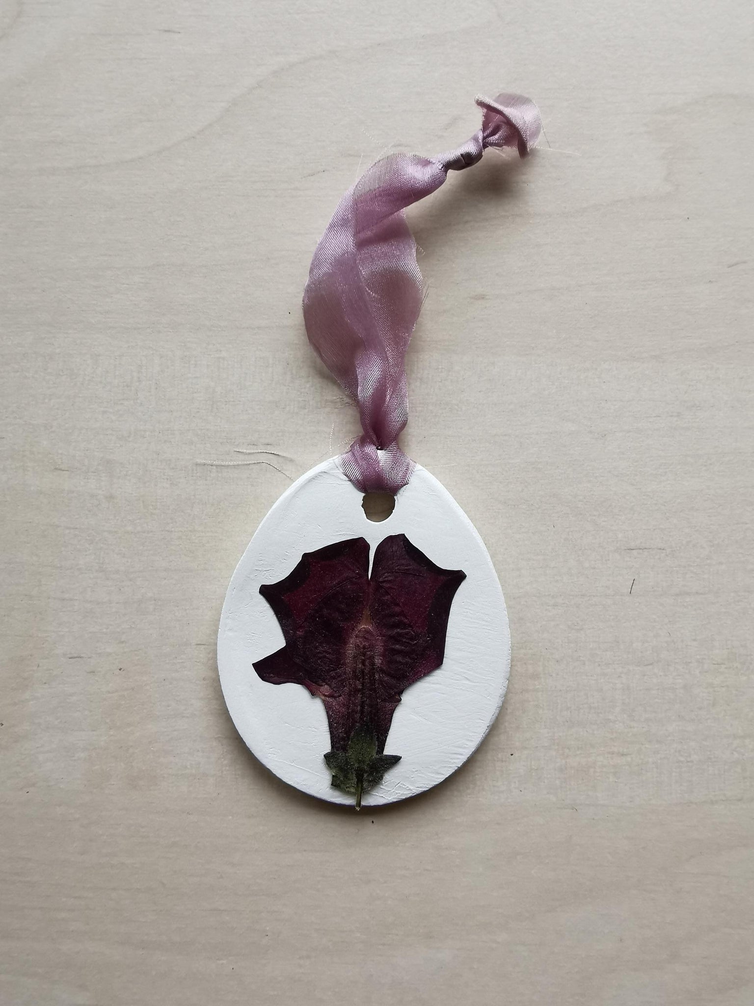 Et unikt lille ophæng i hvidt ler med en fin presset lilla blomst.