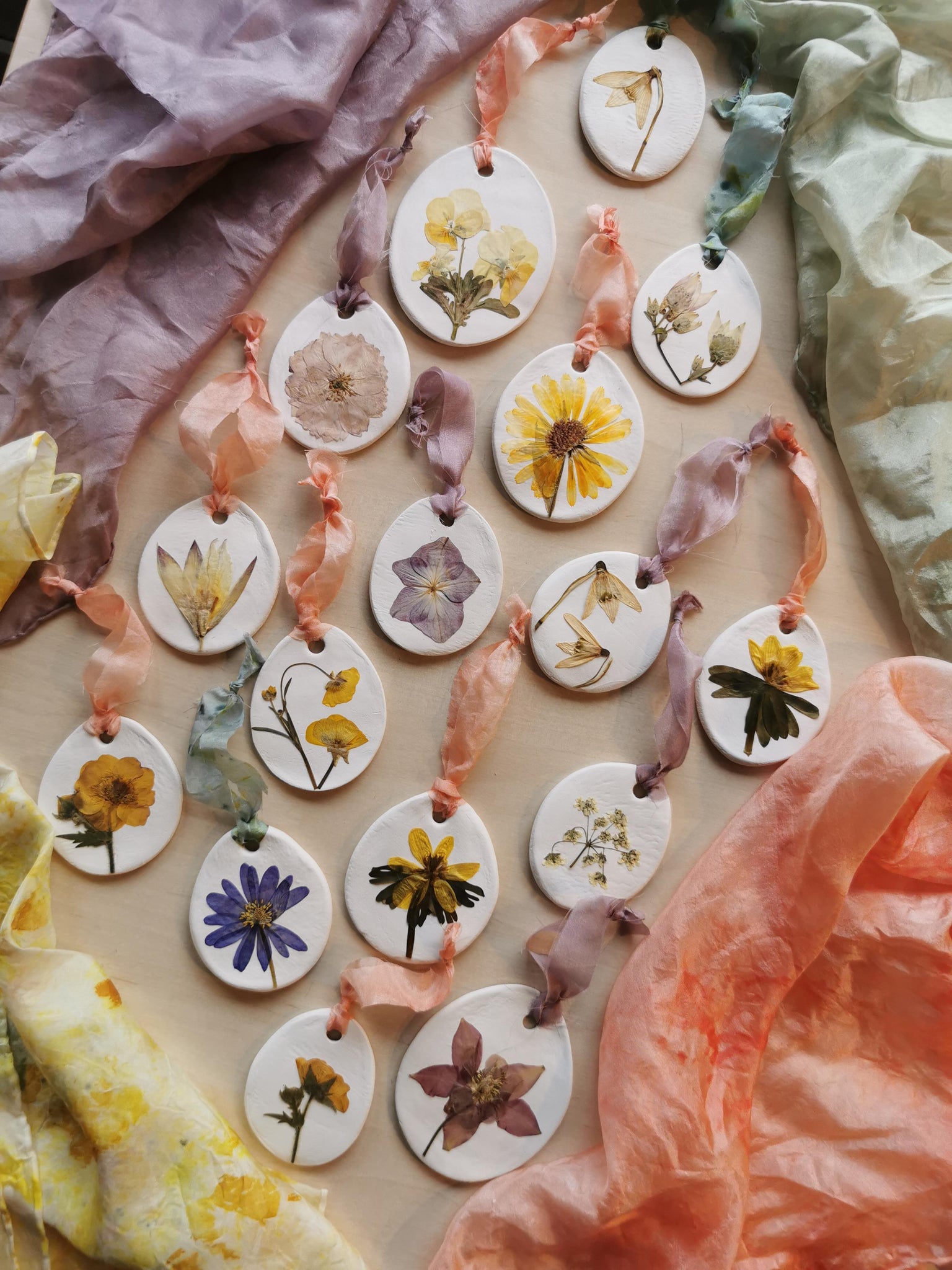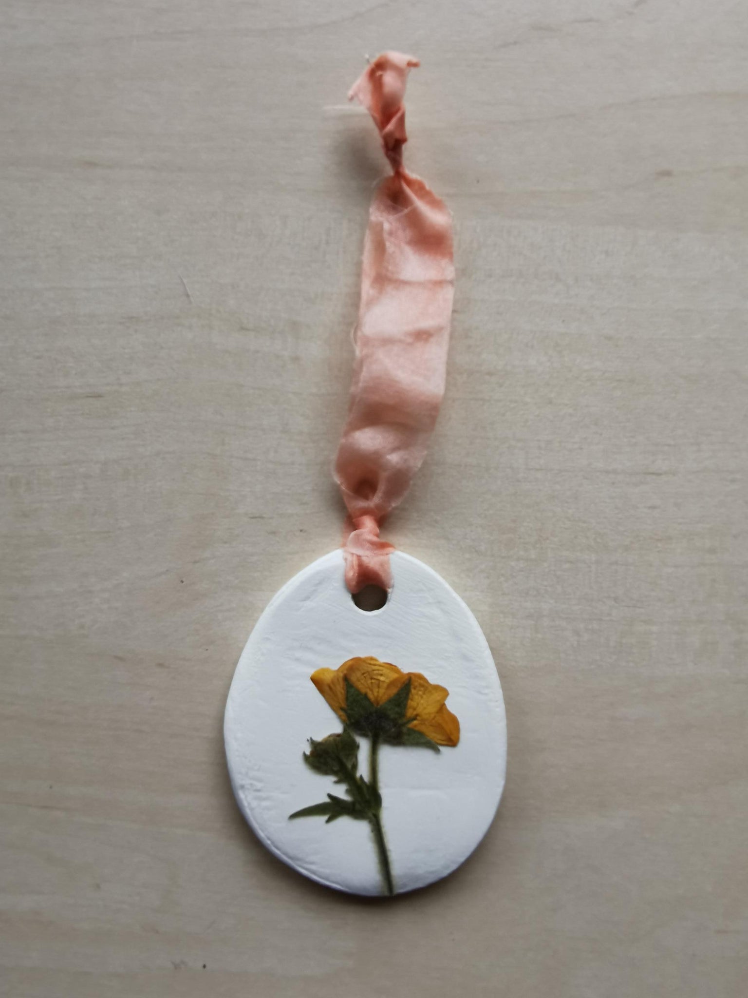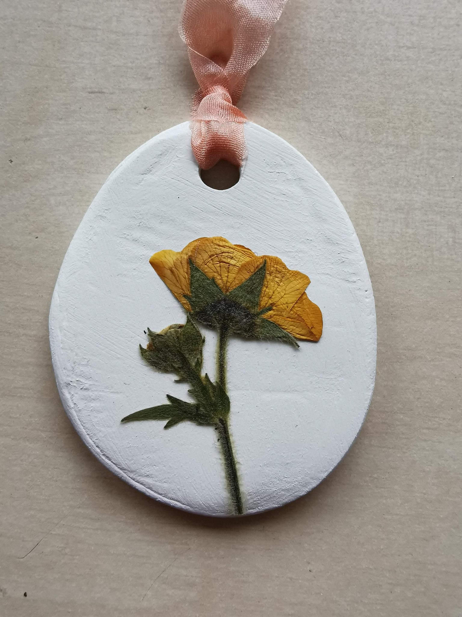 Et unikt lille ophæng i hvidt ler med en fin presset ranunkel.