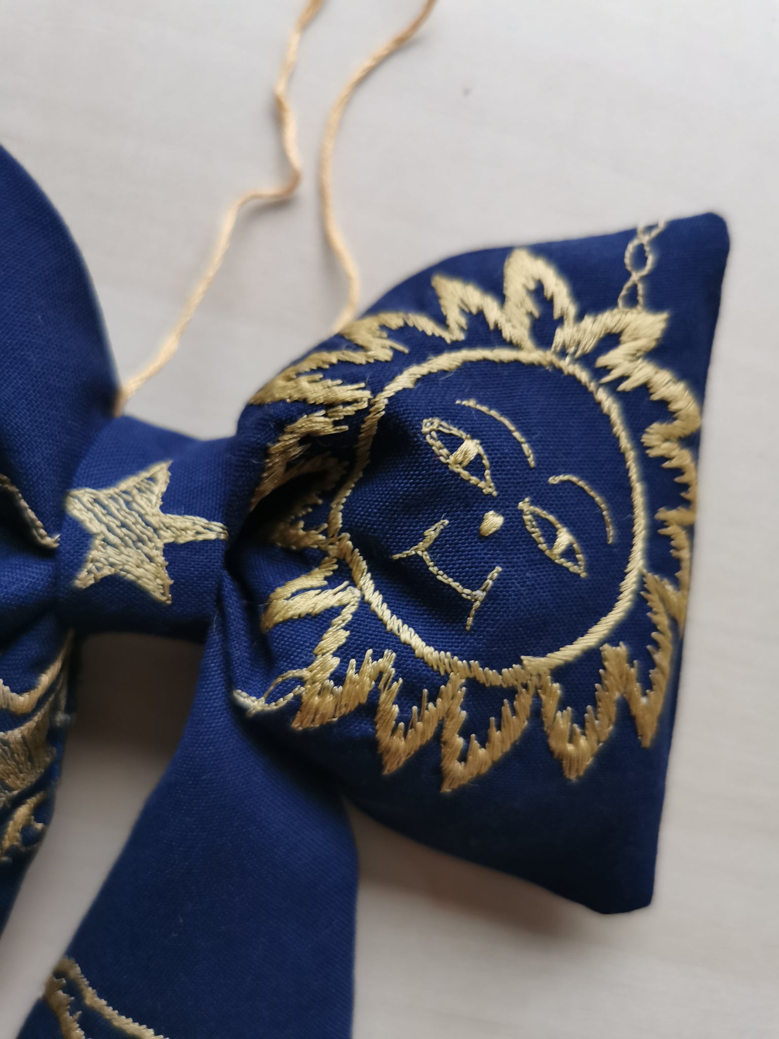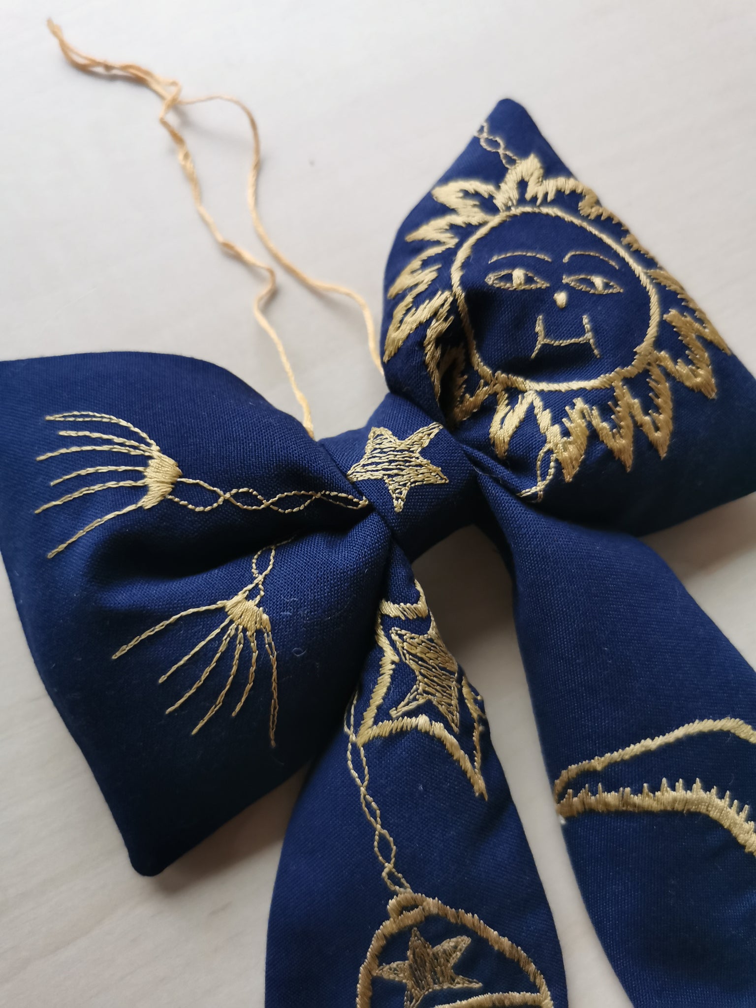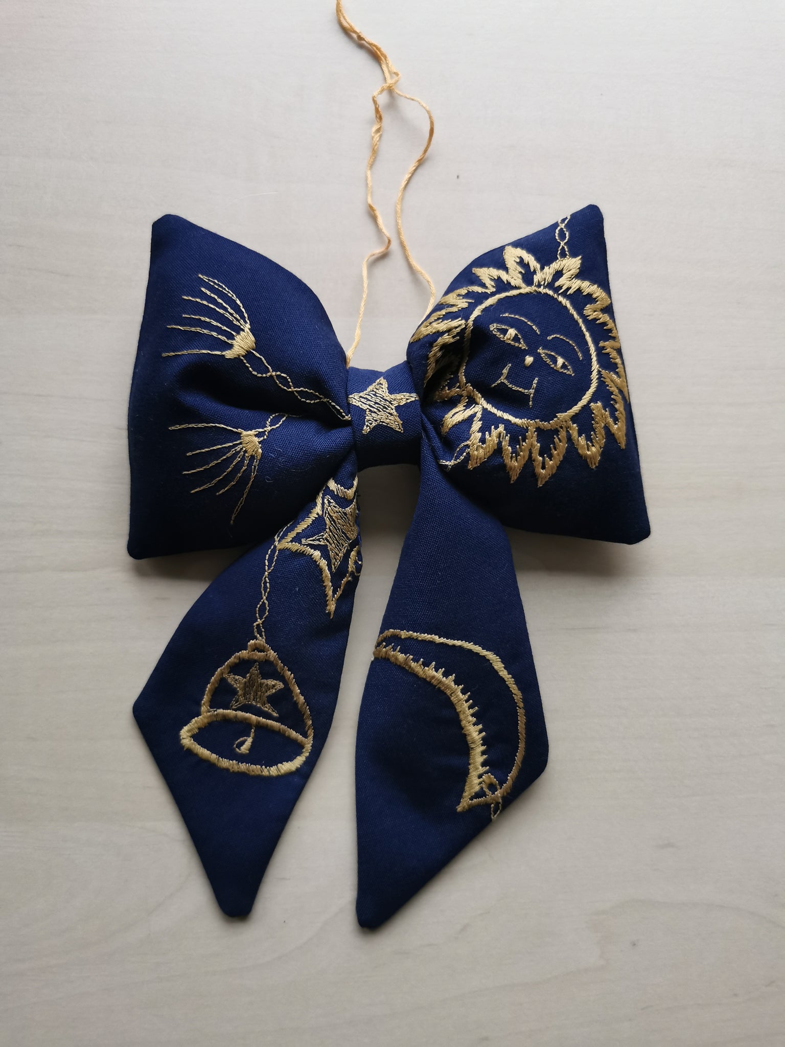 En fin sløjfe til ophæng syet af af detaljeret broderet vintagestof. Baggrundsfarven er midnatsblå med fine guldbroderier på.