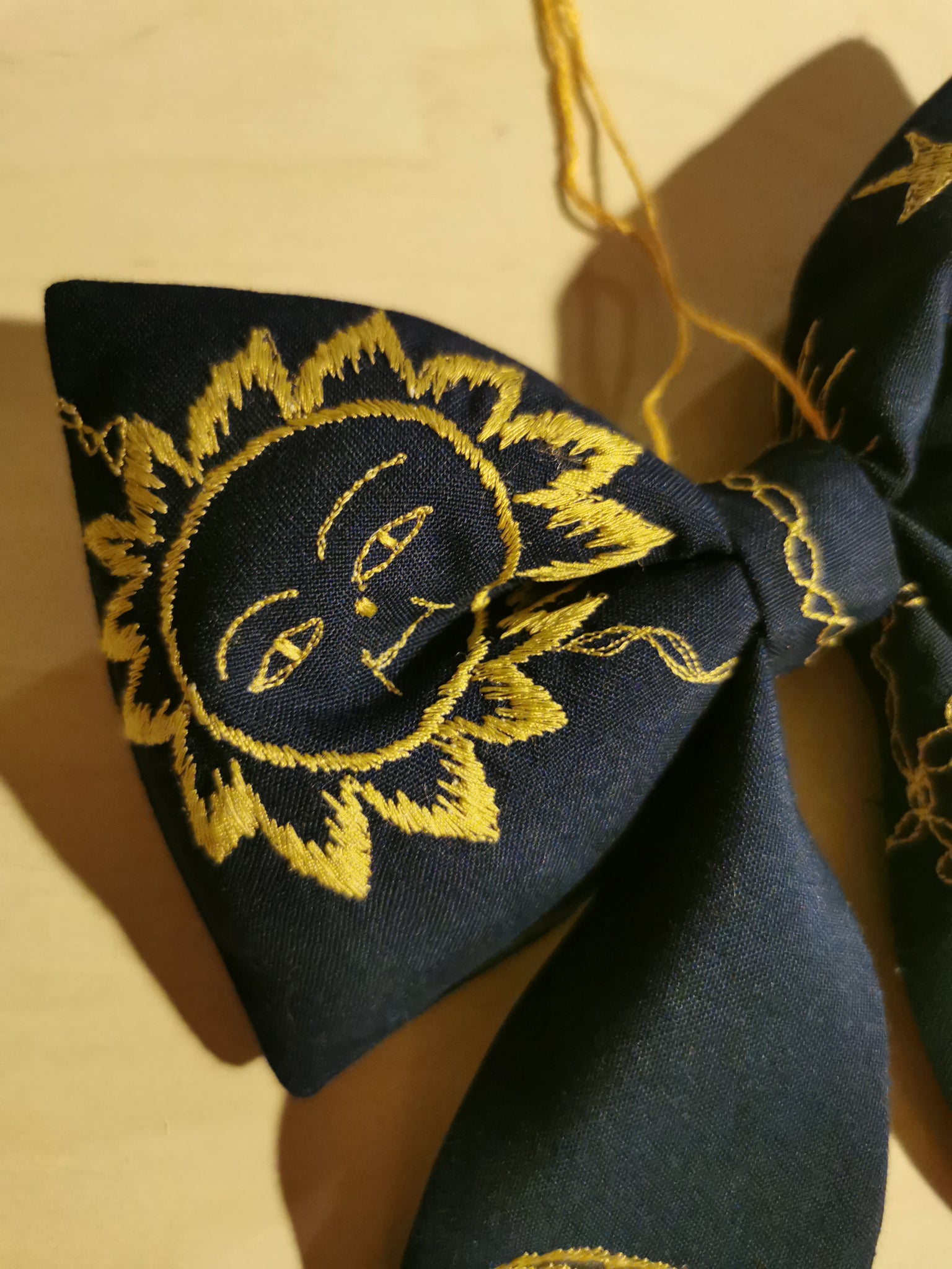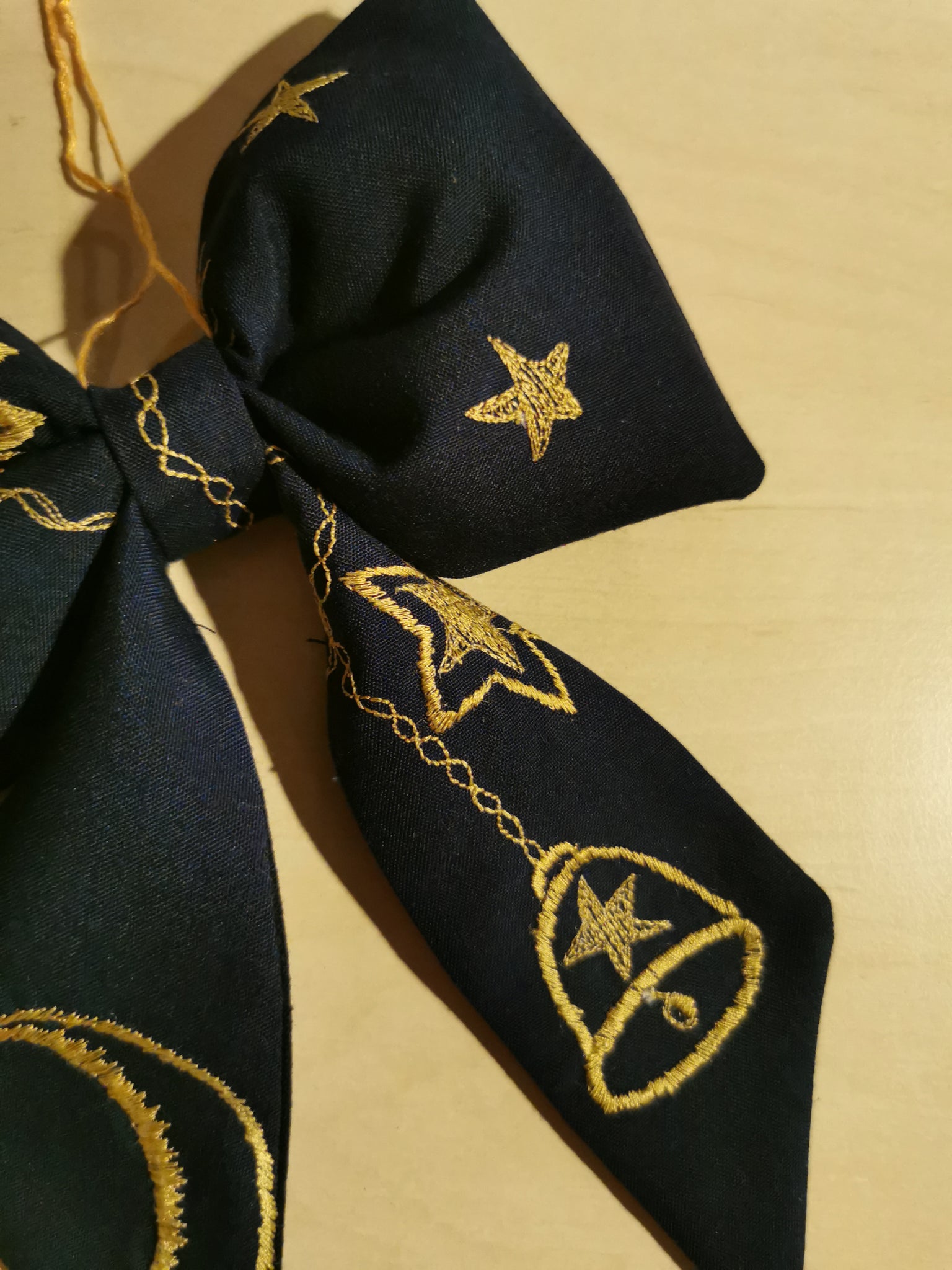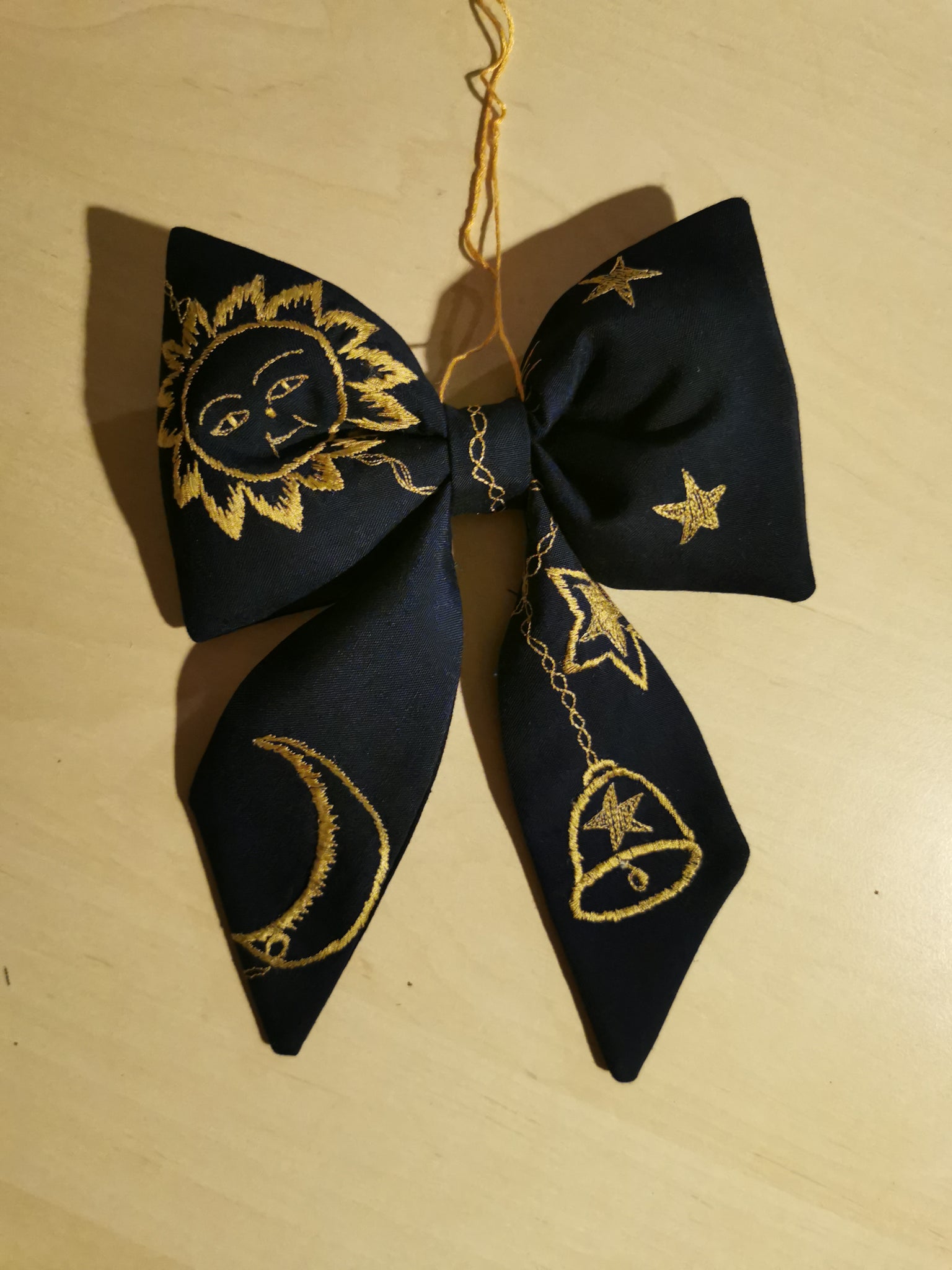 En fin sløjfe til ophæng syet af af detaljeret broderet vintagestof. Baggrundsfarven er midnatsblå med fine guldbroderier på.