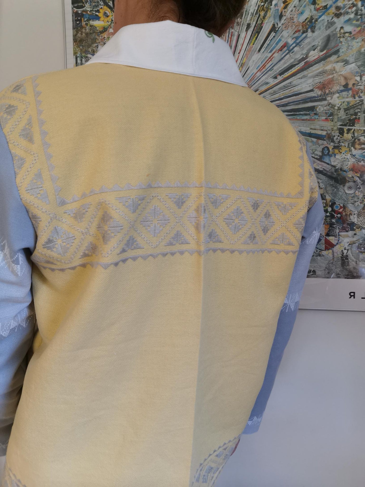 Patchworkskjorte syet af tre forskellige vintageduge med smukt udført håndbroderi. Skjortens primære farver er grå og gul, og så har den fine blomsterdetaljer som også er håndbroderede. Skjorten har en fin, afrundet krave og et løst snit.