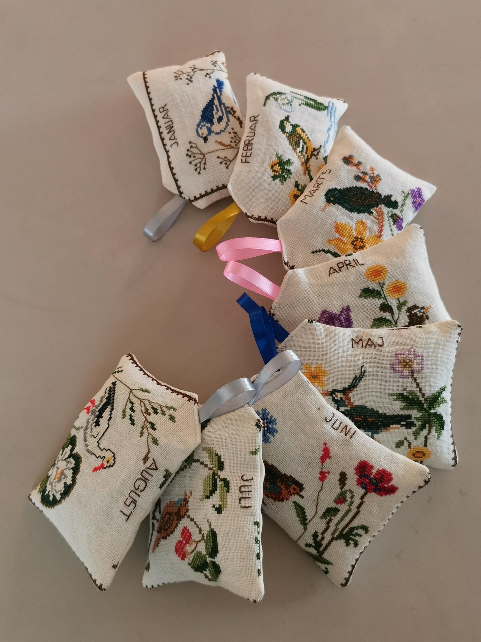 Posen har motiv af årstidens fugle og blomster.