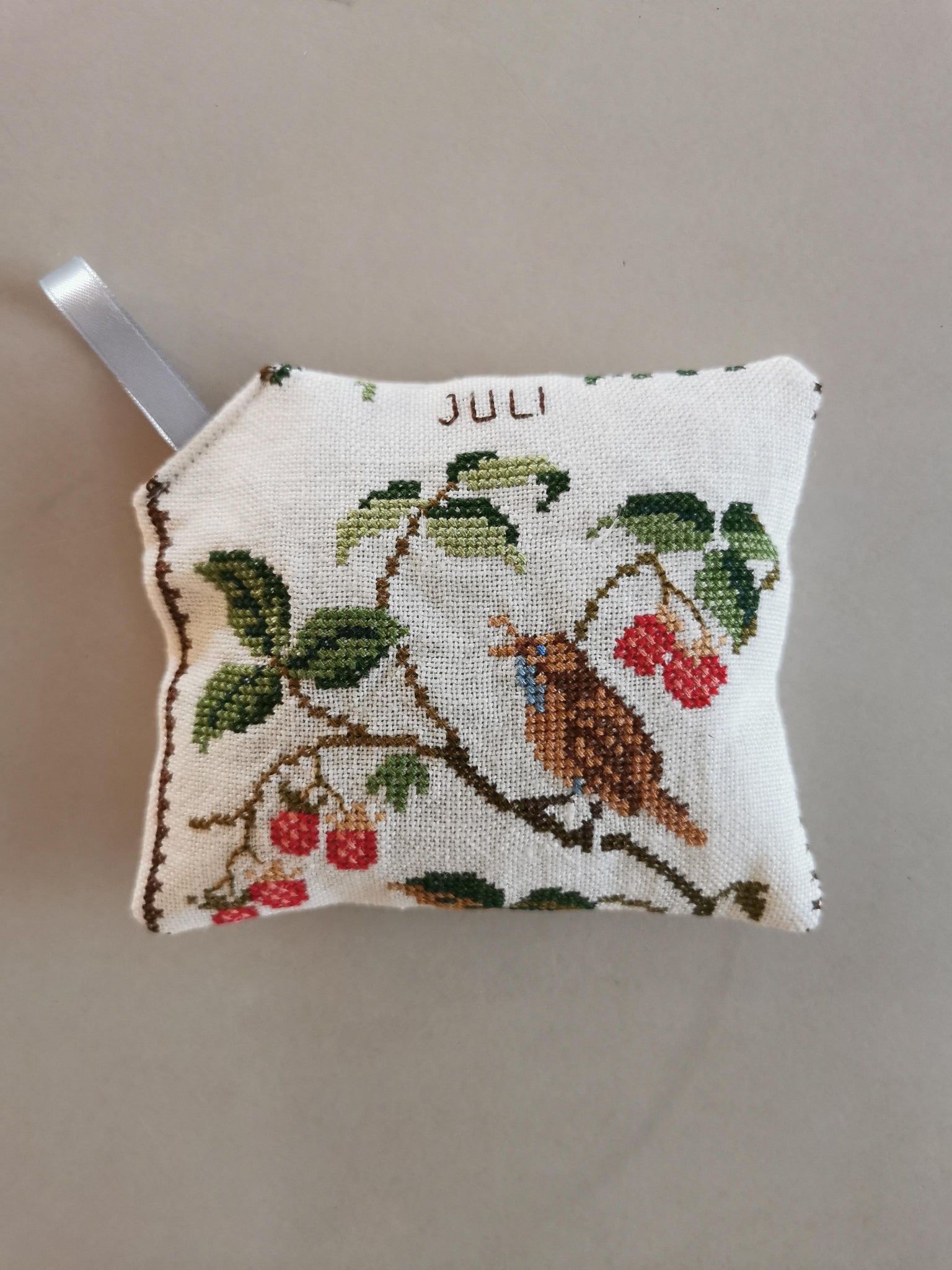 En fin lille duftpose syet af håndbroderet genbrugsstof.