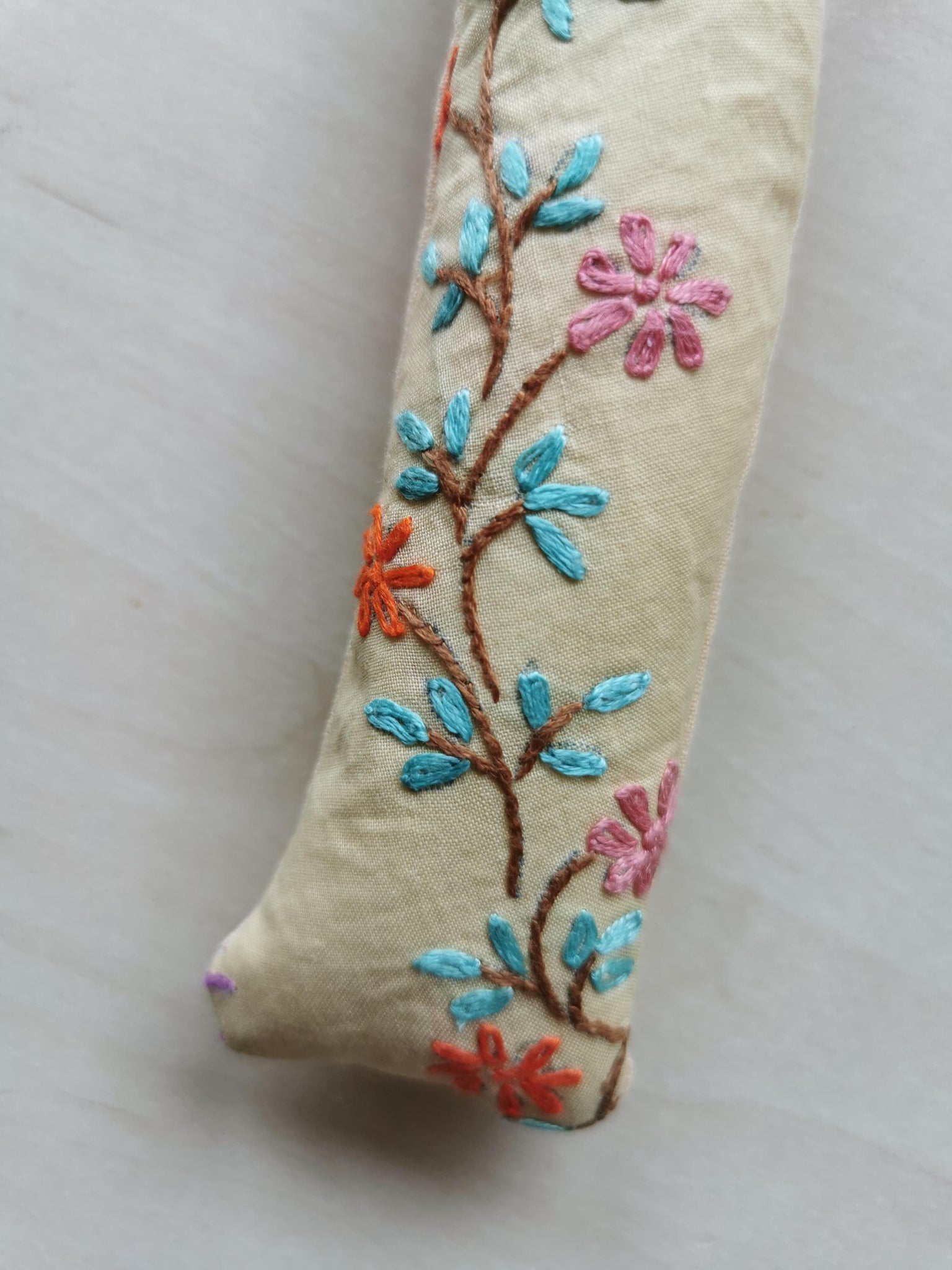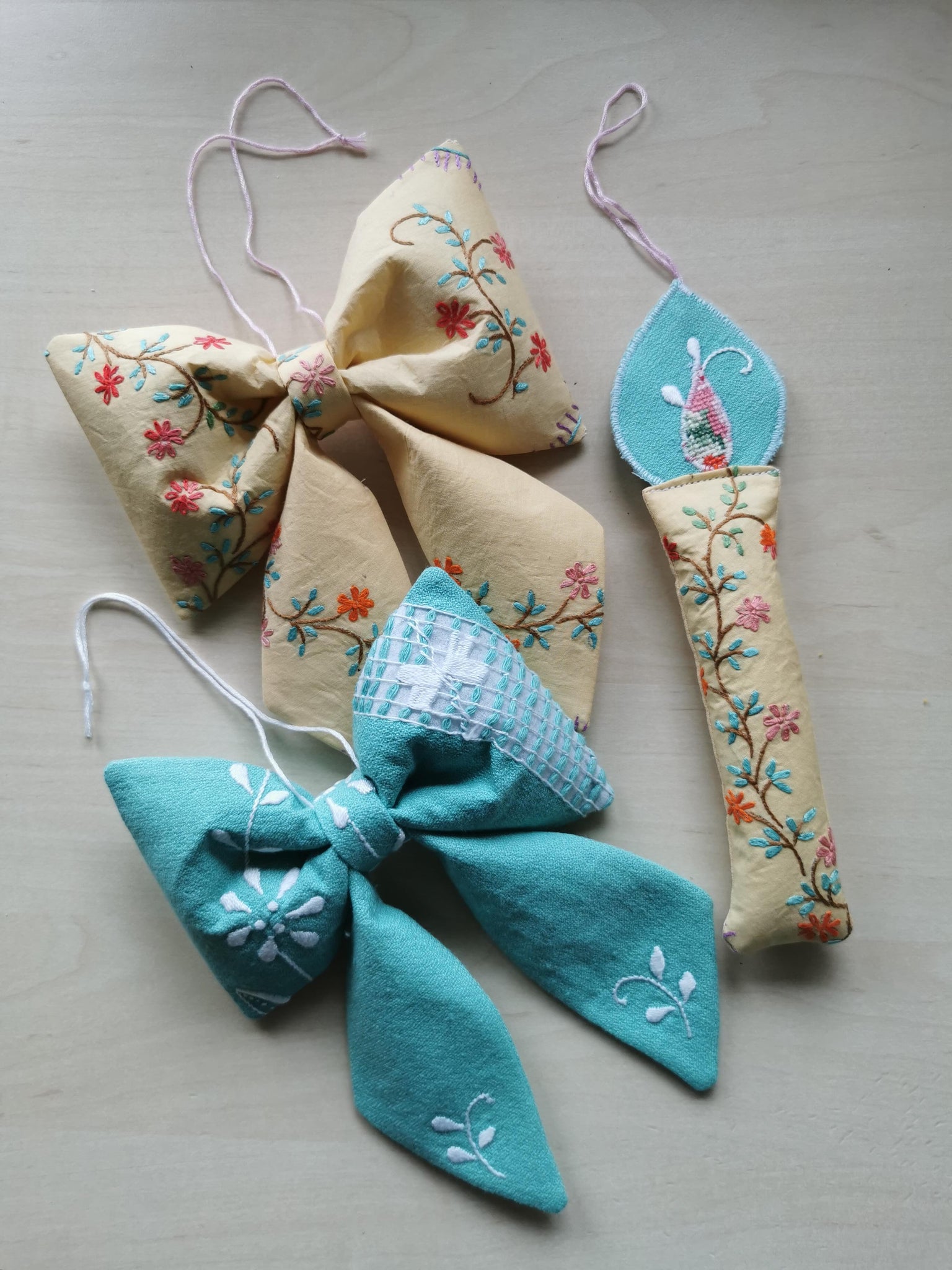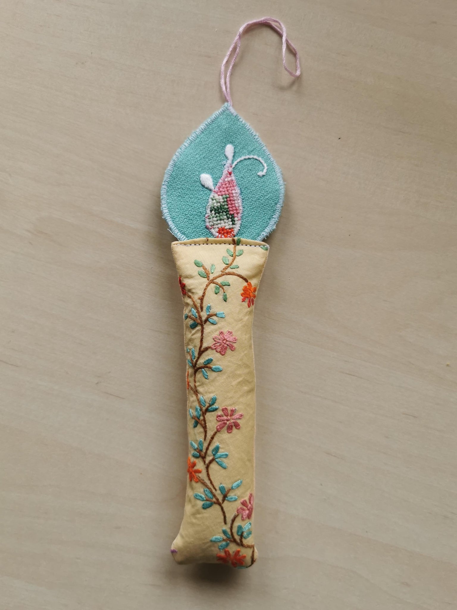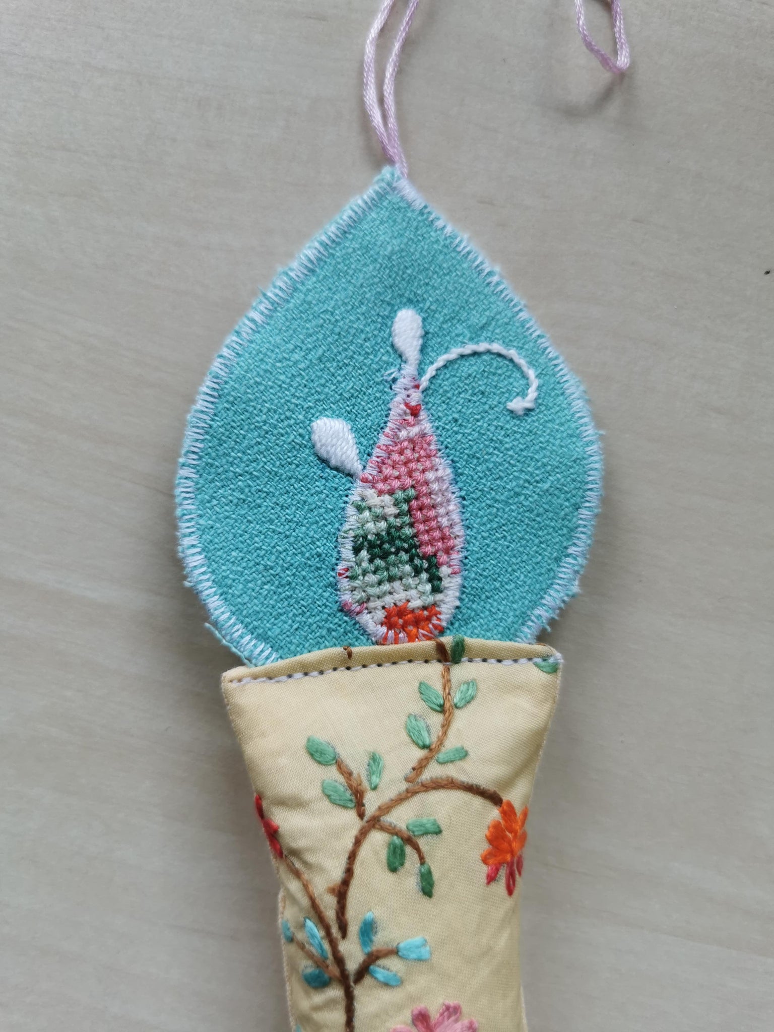 Evighedslys syet af forskellige slags vintagetekstil i fine rosa, turkise og gyldne farver.