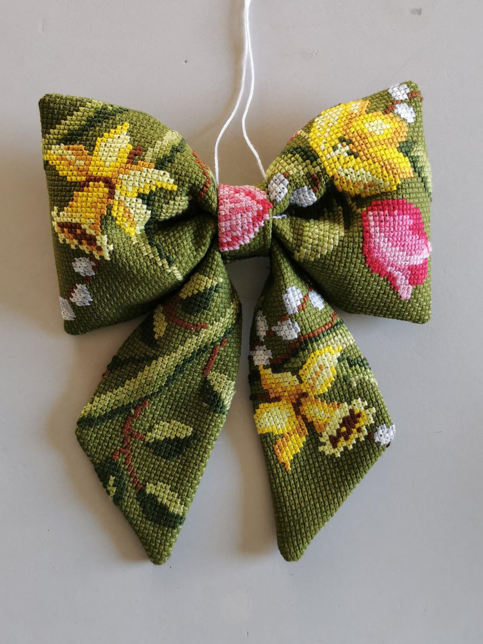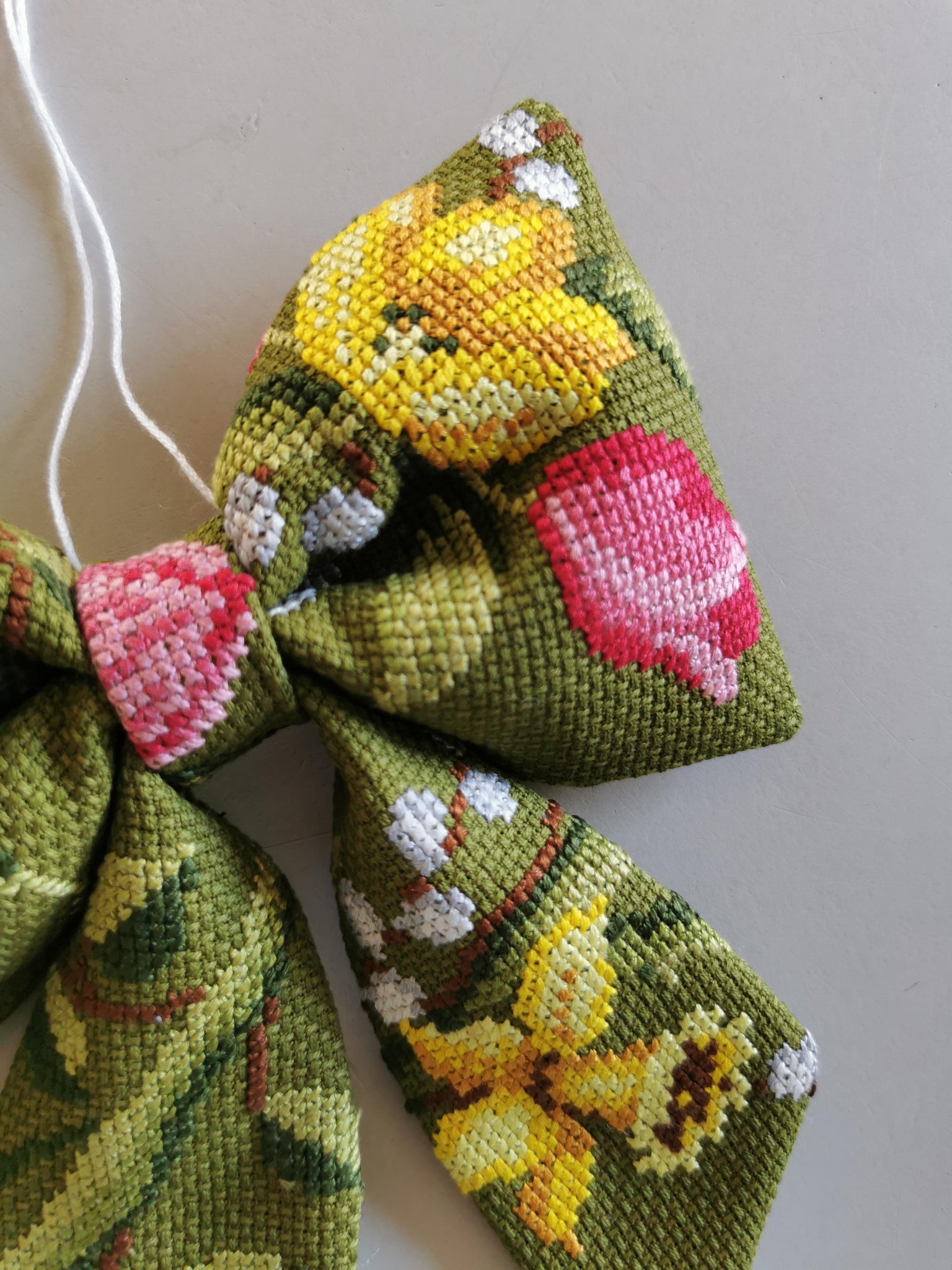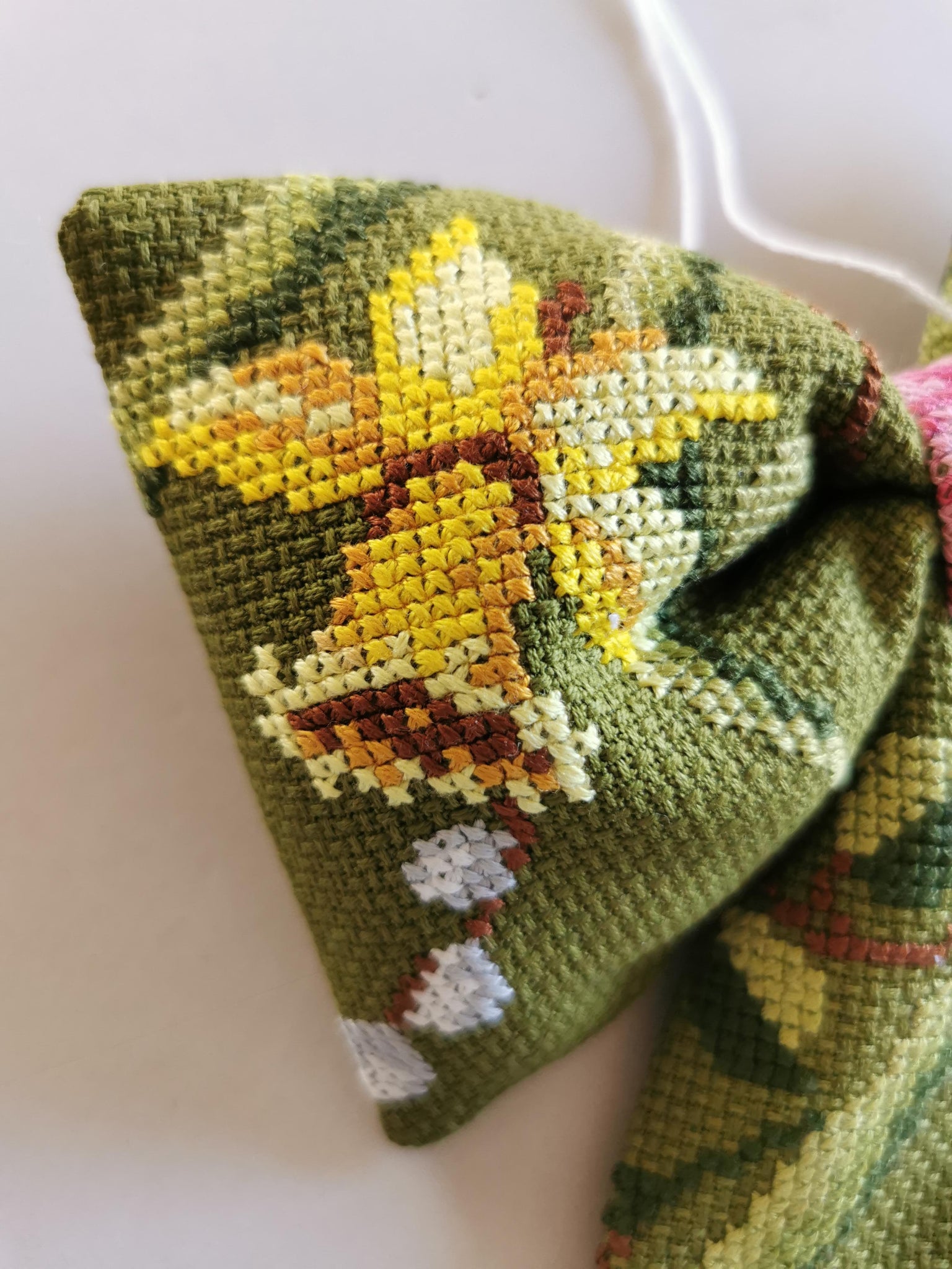 En fin sløjfe til ophæng syet af af detaljeret broderet vintagestof. Baggrundsfarven er grøn med fine korsstingsbroderier af farverige forårsblomster.