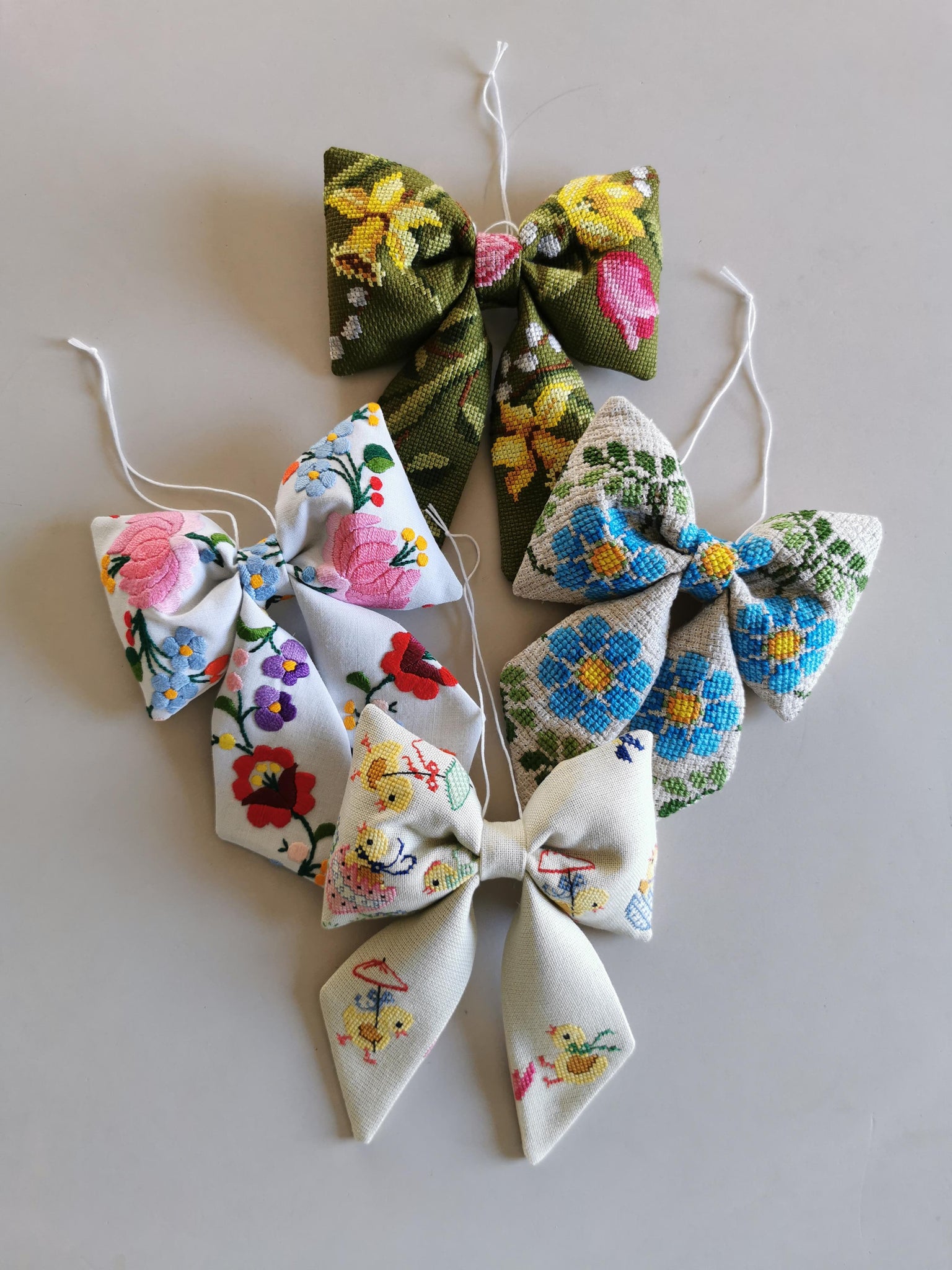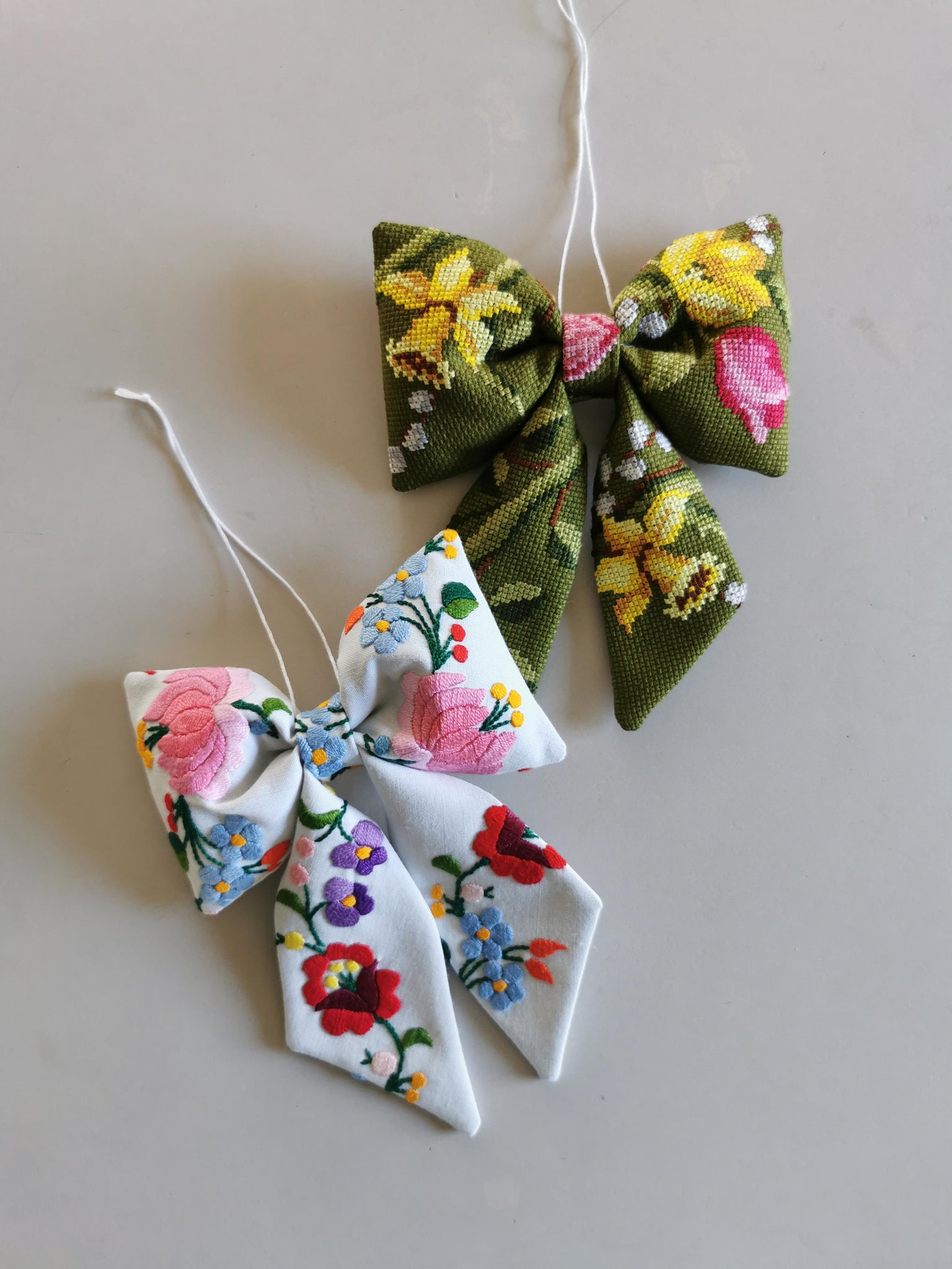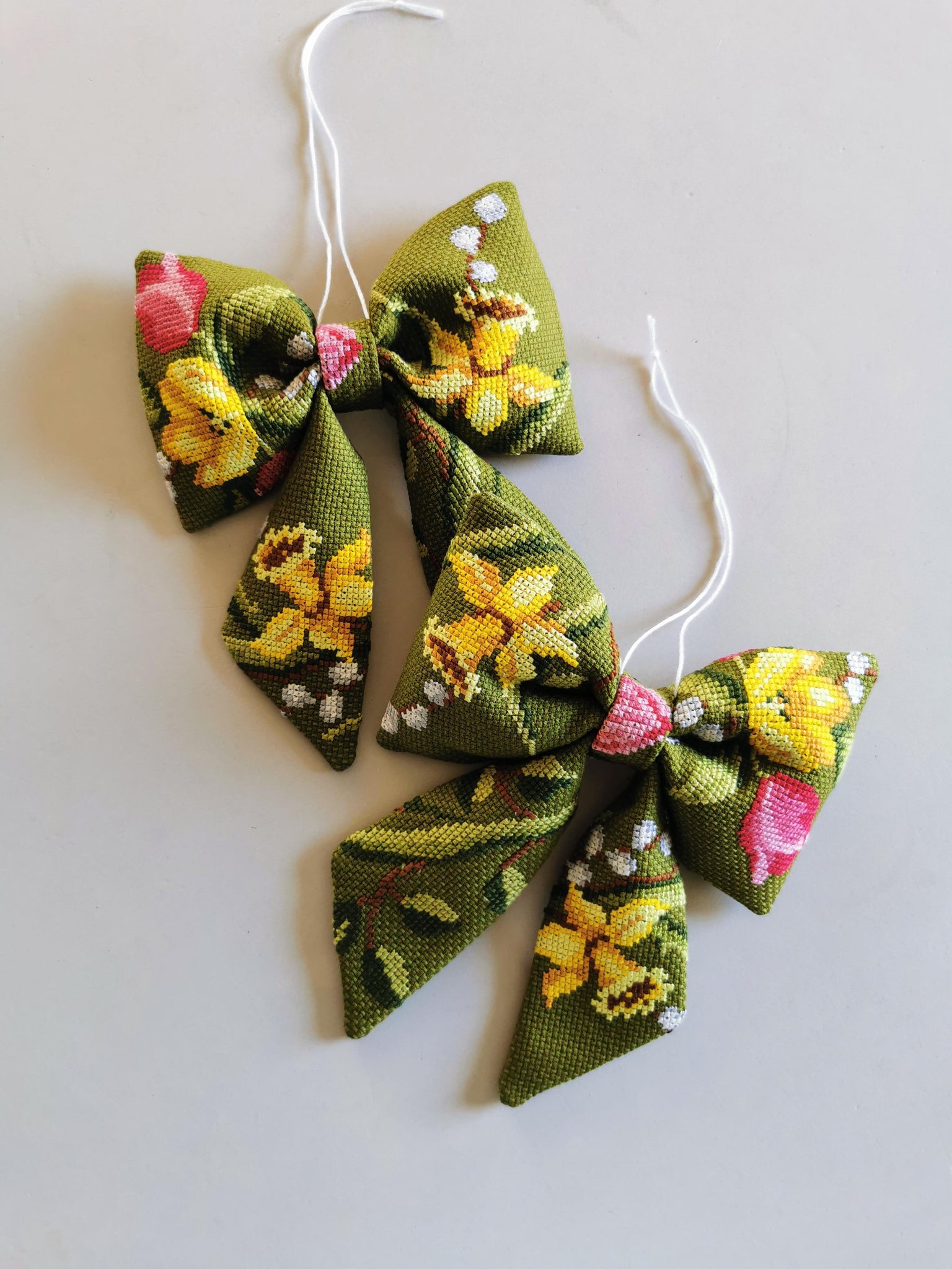 En fin sløjfe til ophæng syet af af detaljeret broderet vintagestof. Baggrundsfarven er grøn med fine korsstingsbroderier af farverige forårsblomster.