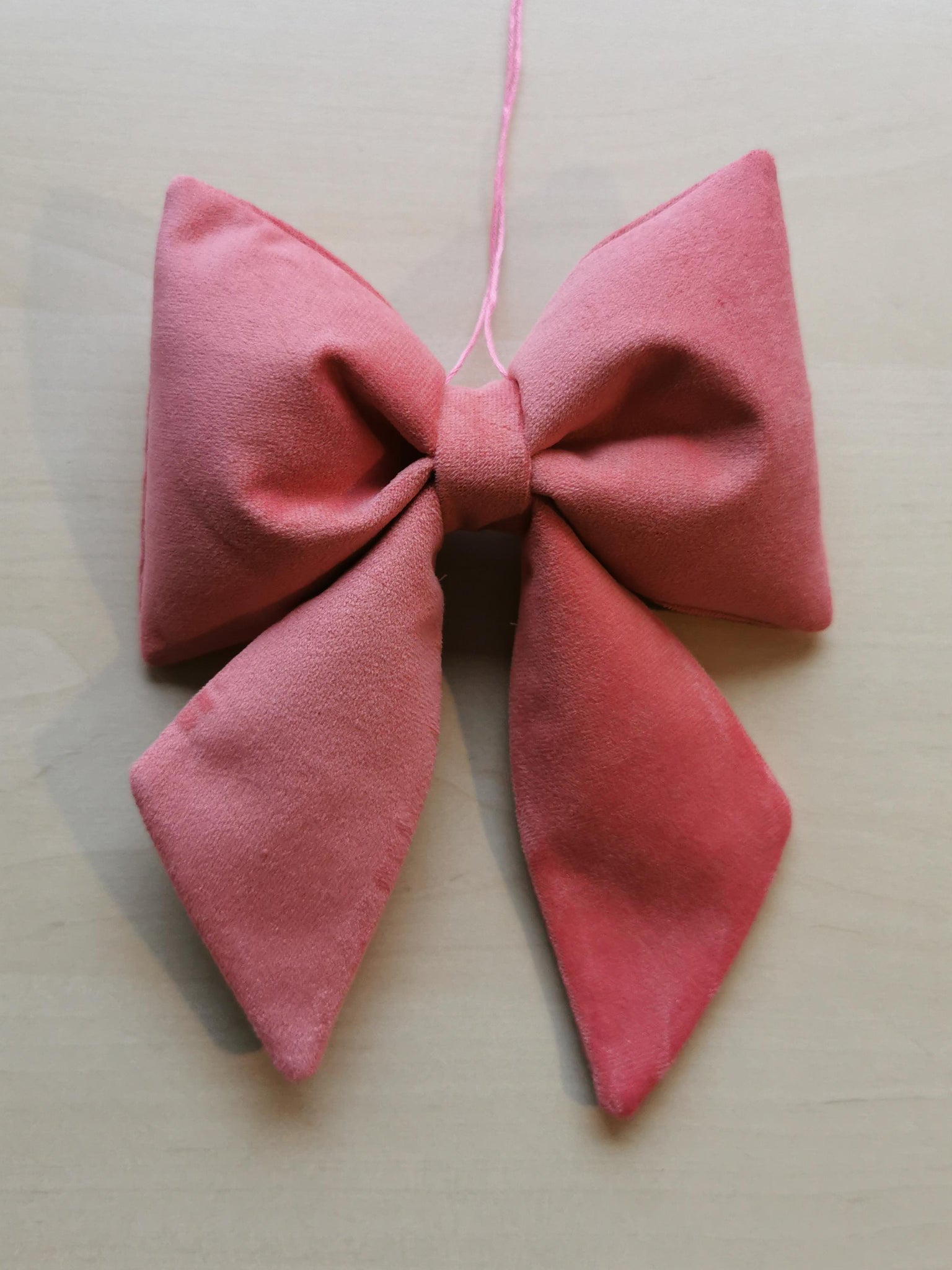 En fin sløjfe til ophæng syet af blødt velour i en varm pink farve.
