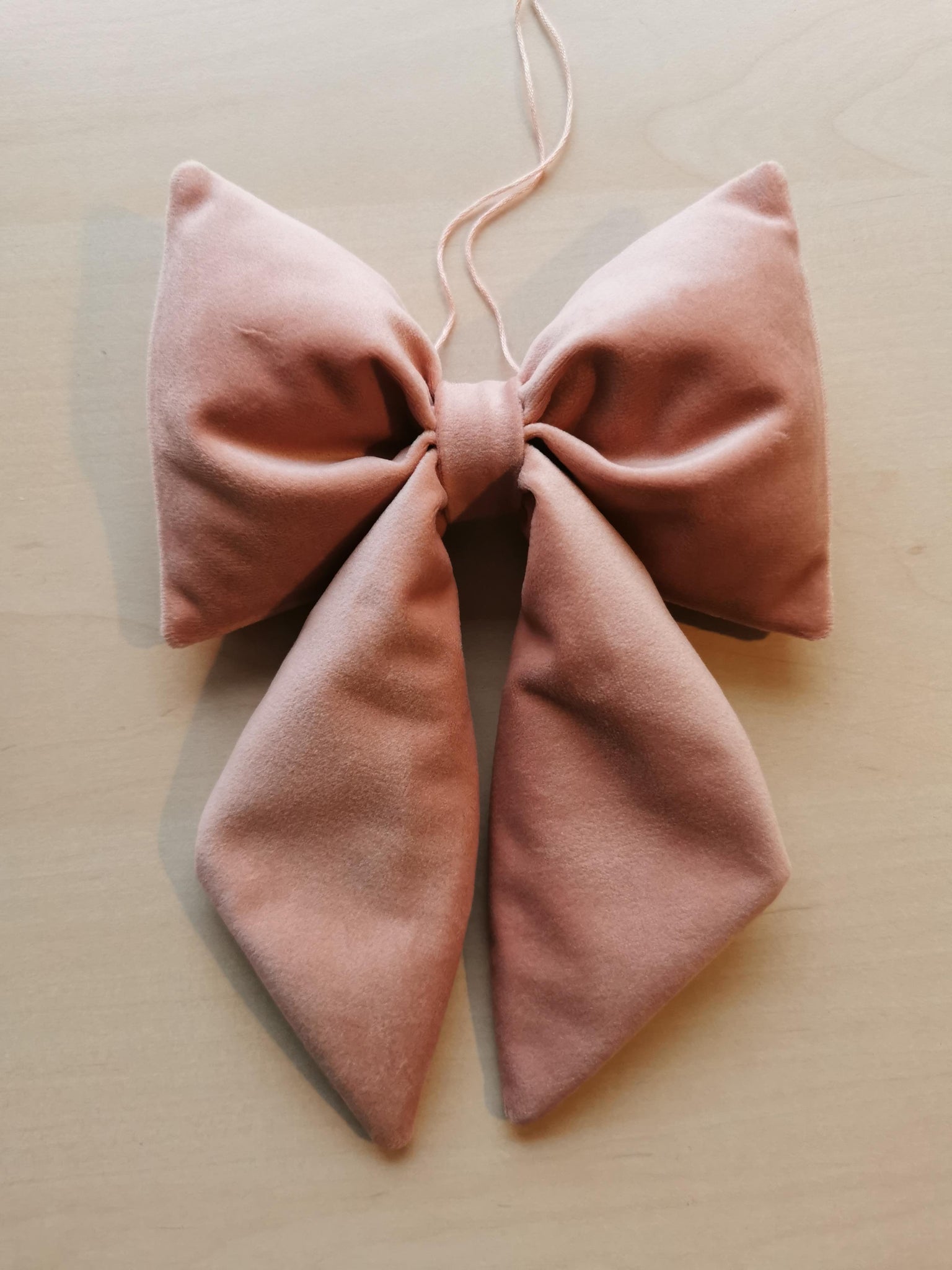 En fin sløjfe til ophæng syet af blødt, gammelrosa velour.