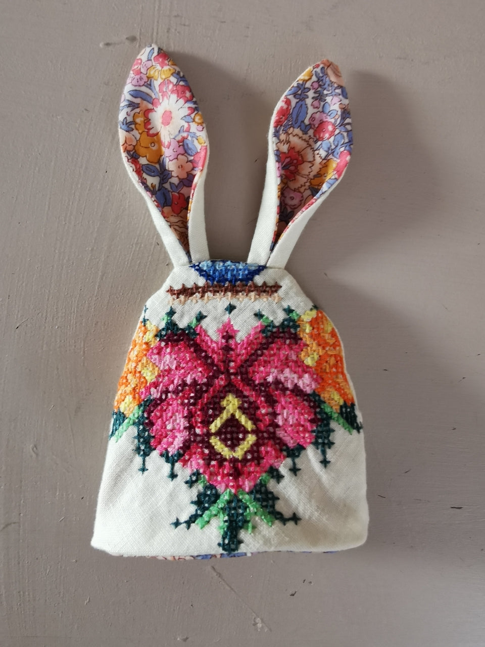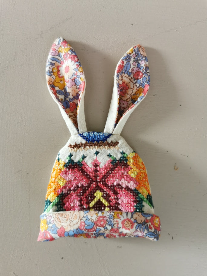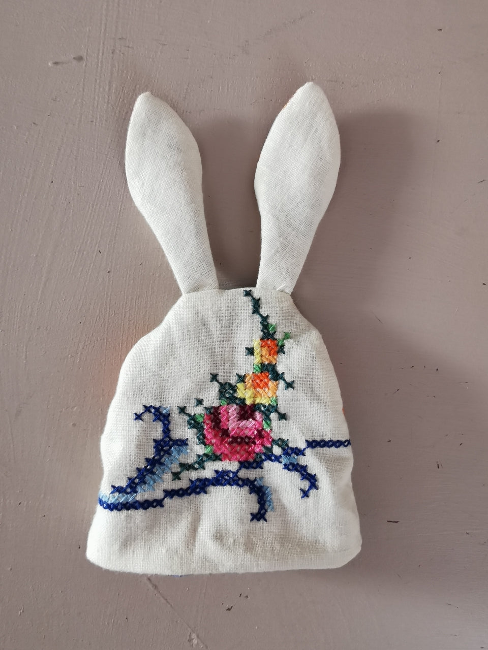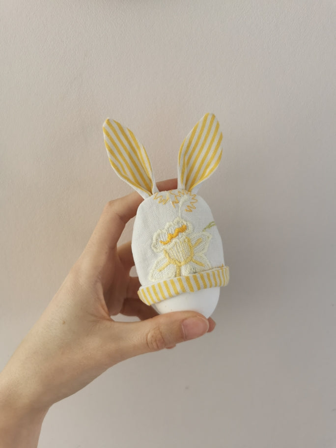 PDF printbart mønster samt udførlig guide med billeder til at sy en æggevarmer med søde små kaninører.