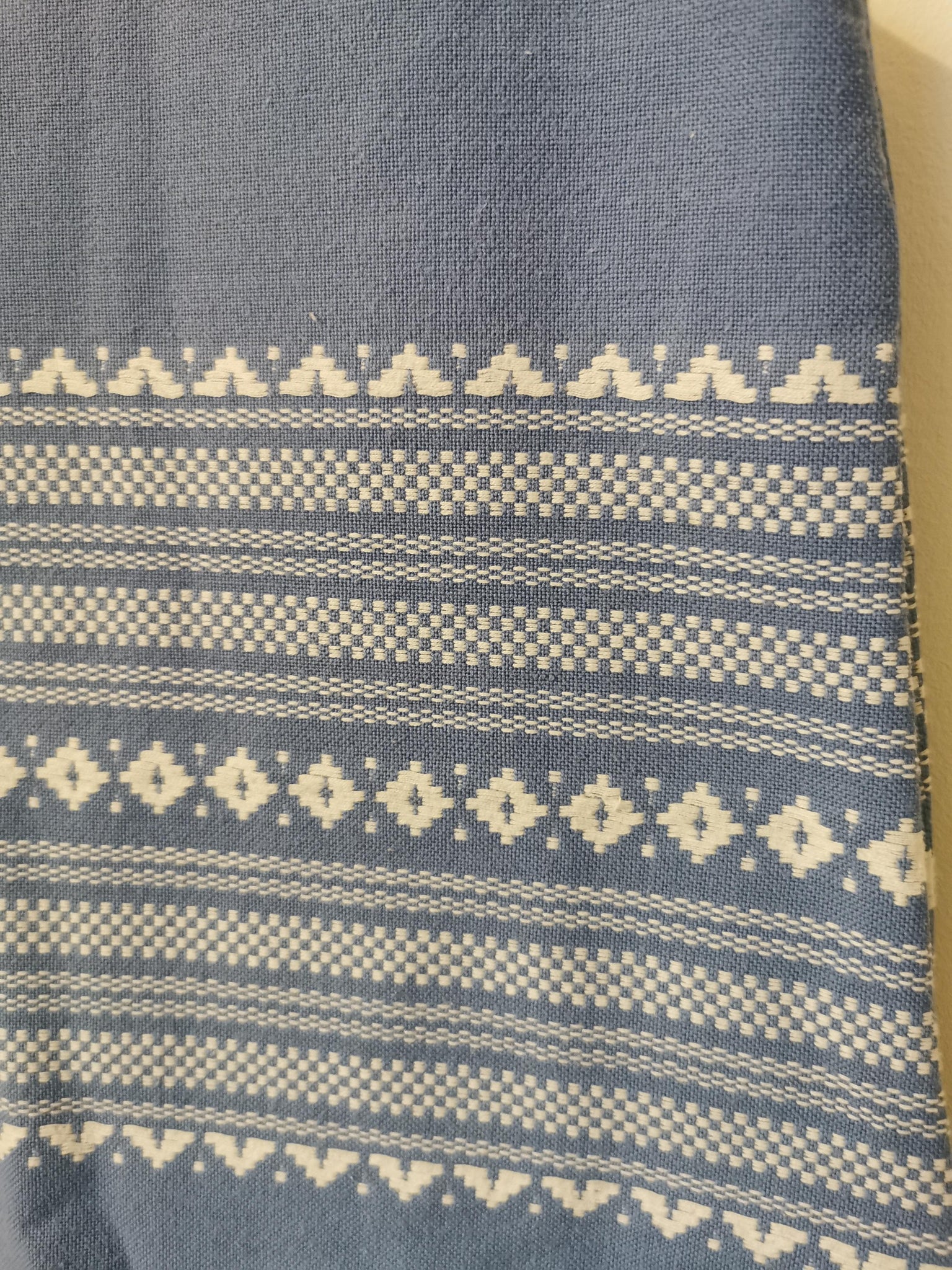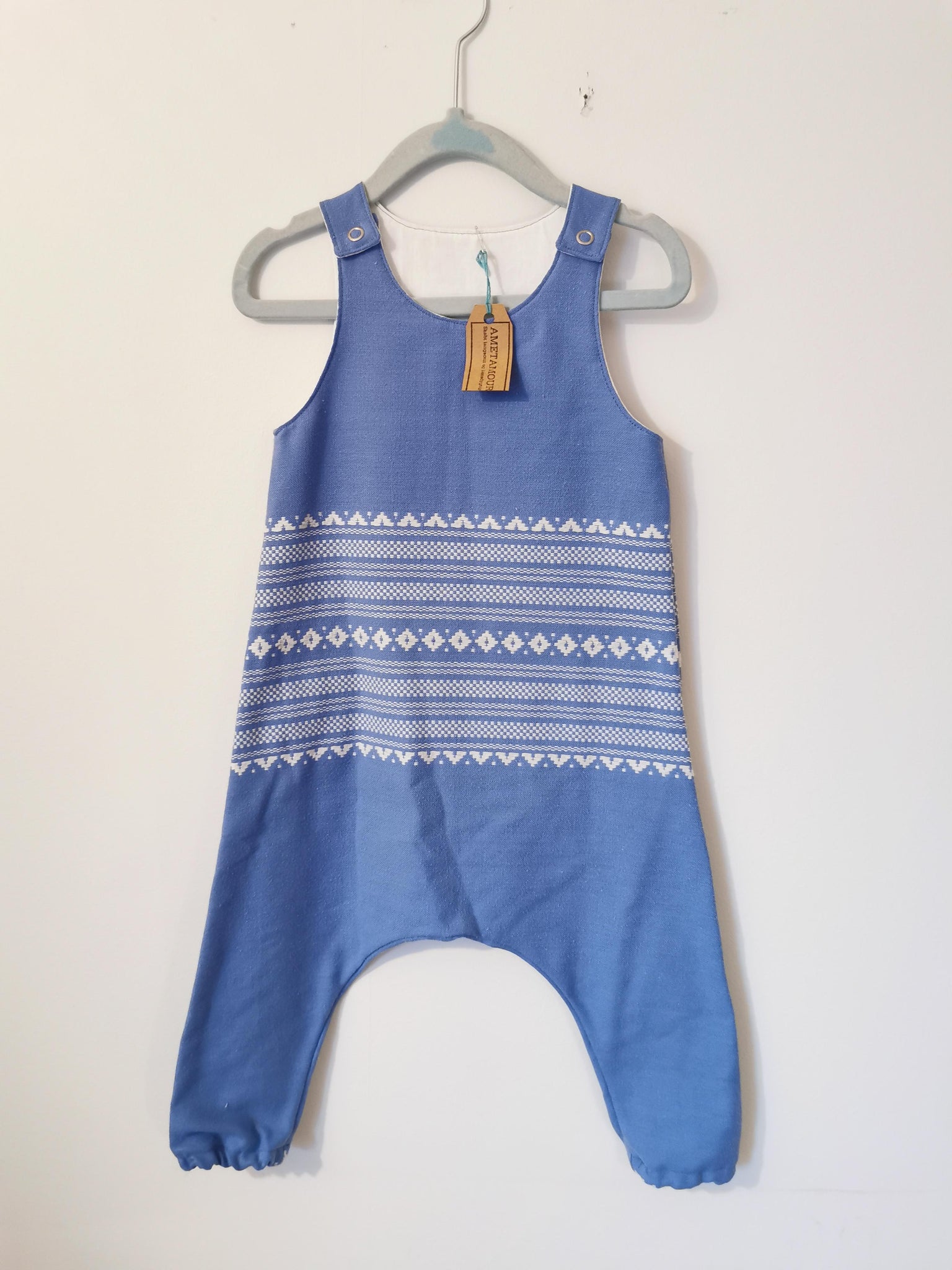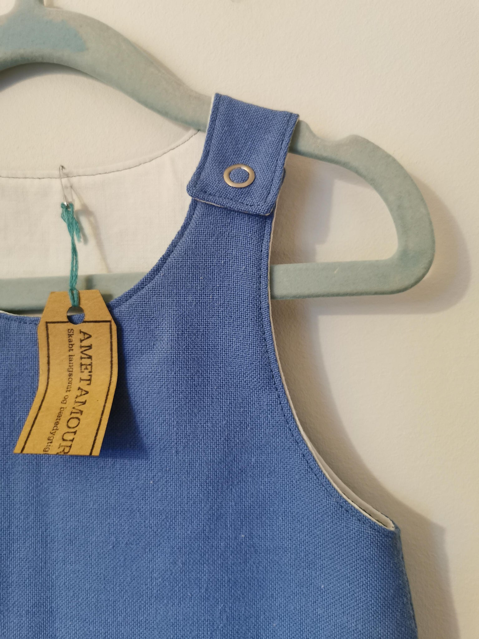 Dragten lukkes med trykknapper ved skuldrene og er syet af vintage tekstil. Den har to knapper, og kan derfor justeres i størrelsen efterhånden som barnet vokser.