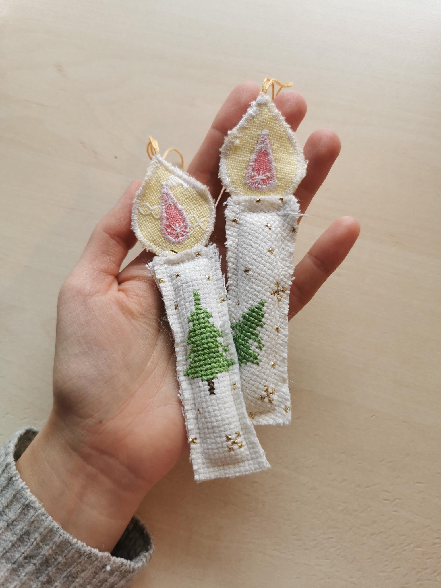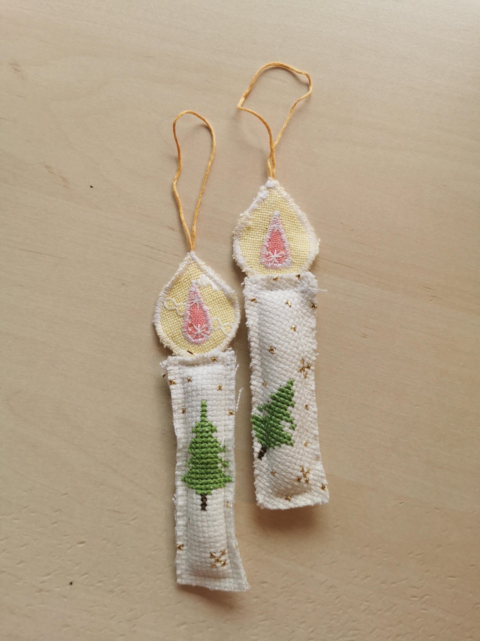 Små evighedslys syet af vintagestof med broderede juletræer og guldstøv.