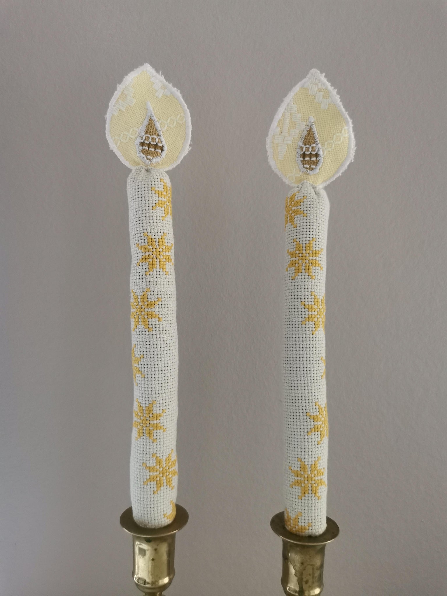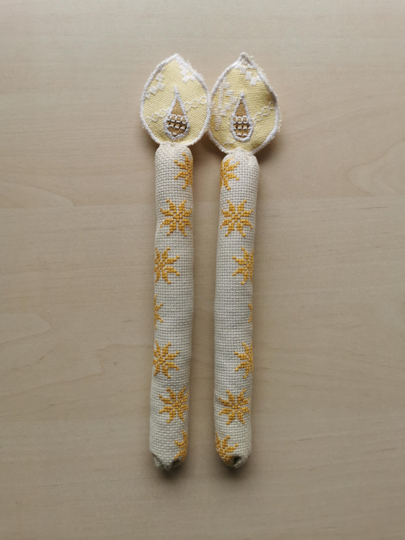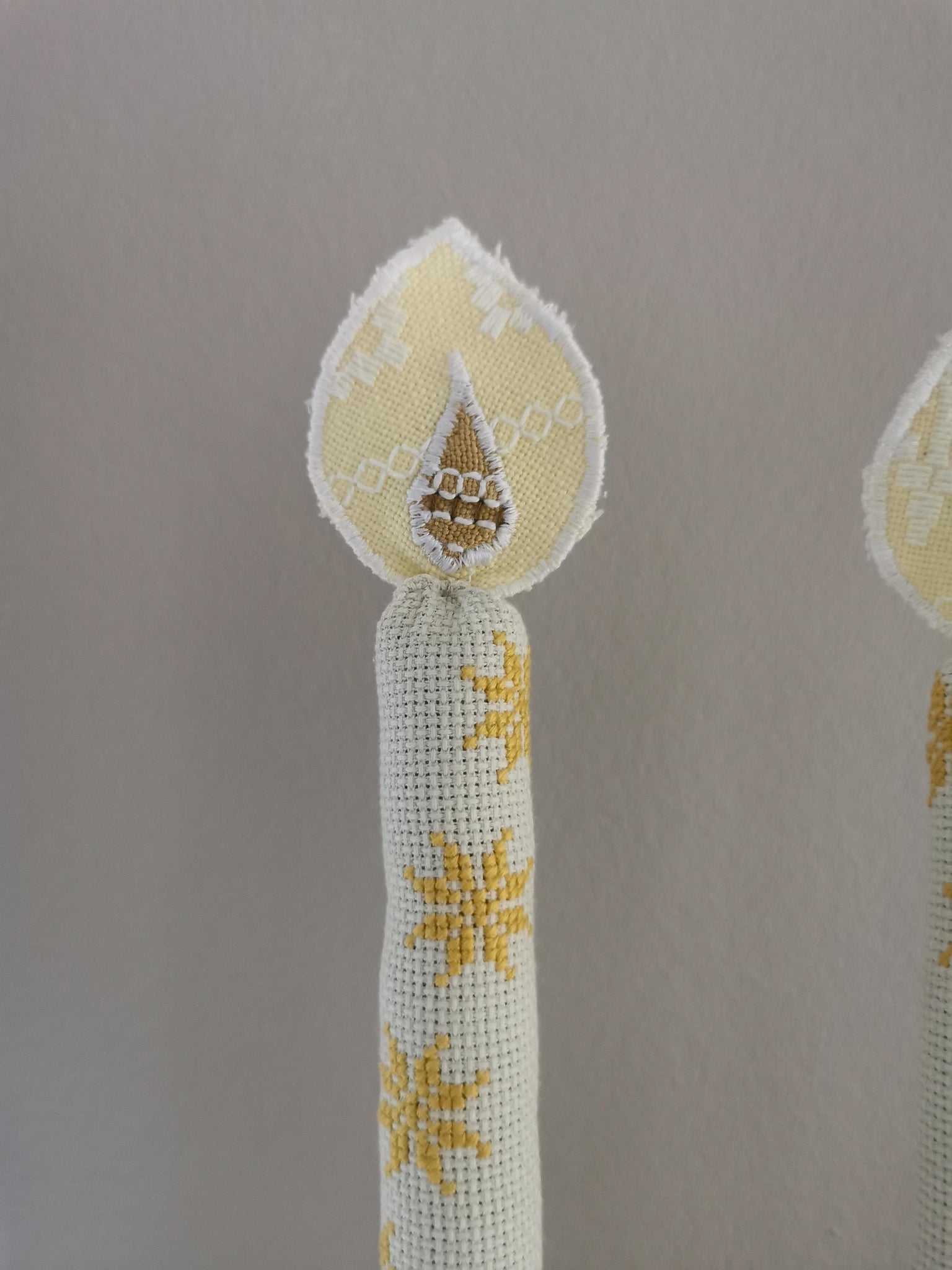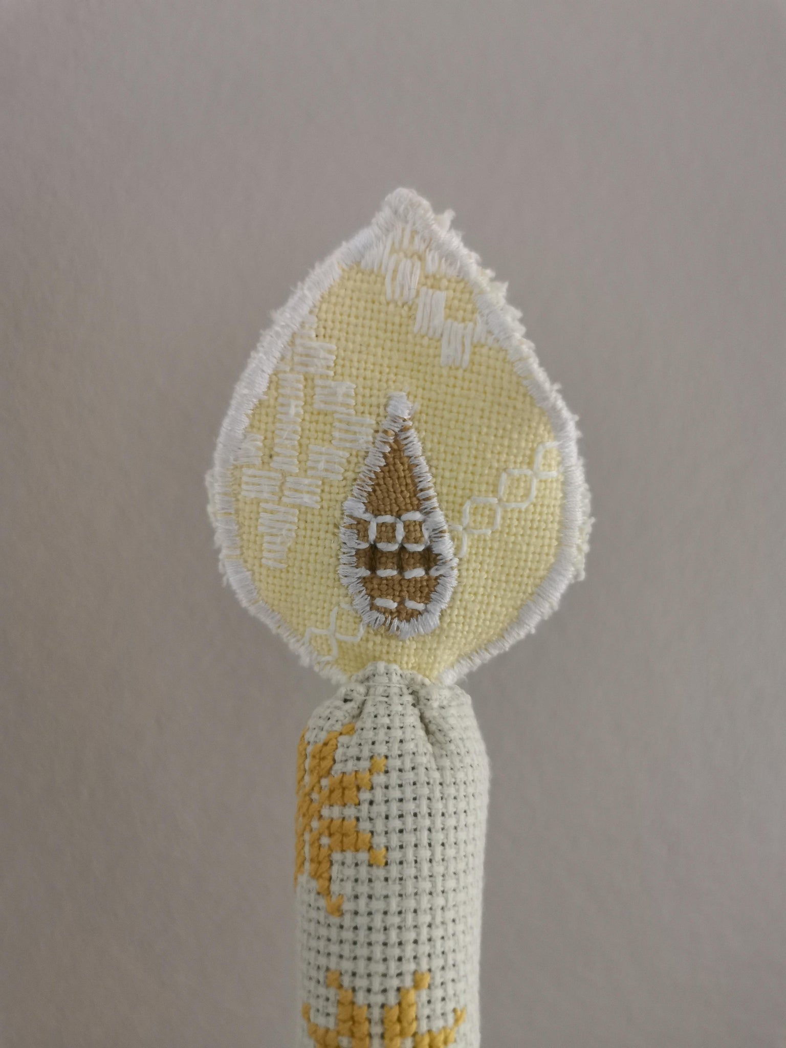 Både lys og den lille flamme er syet af nøje udvalgte vintagematerialer.