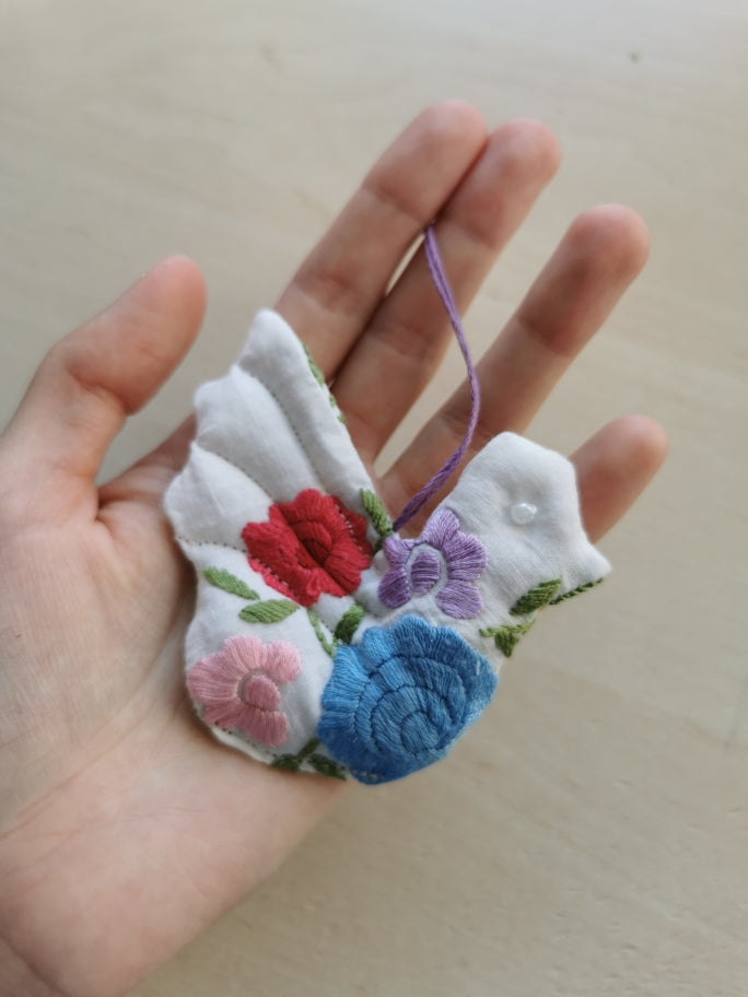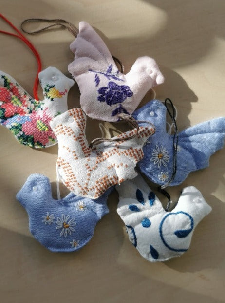 I billedvejledningen får du vist, hvordan du kan bruge fine genbrugsbroderier til at sy nye små ophæng. Det er et godt syprojekt til at få udnyttet små rester.
