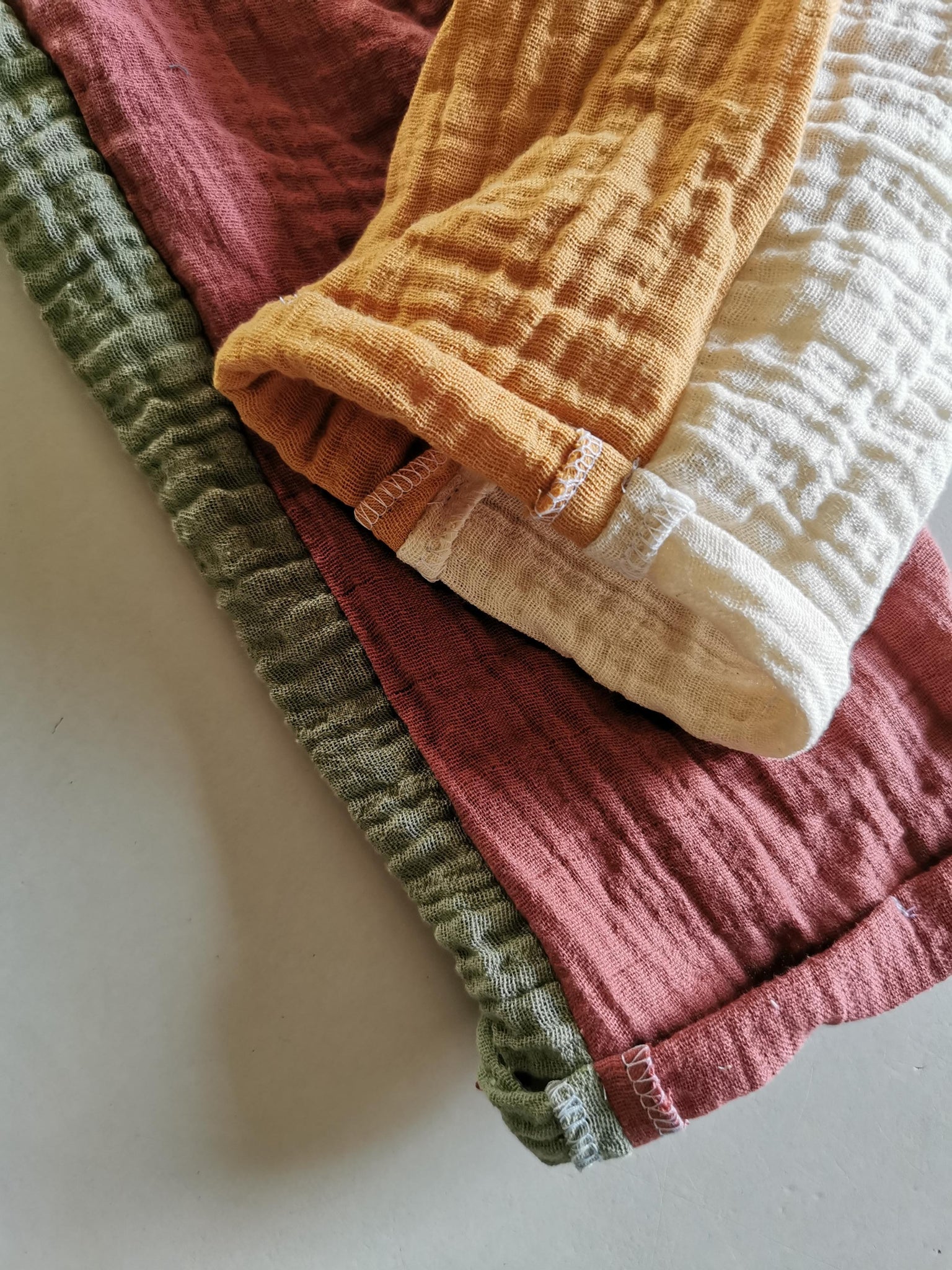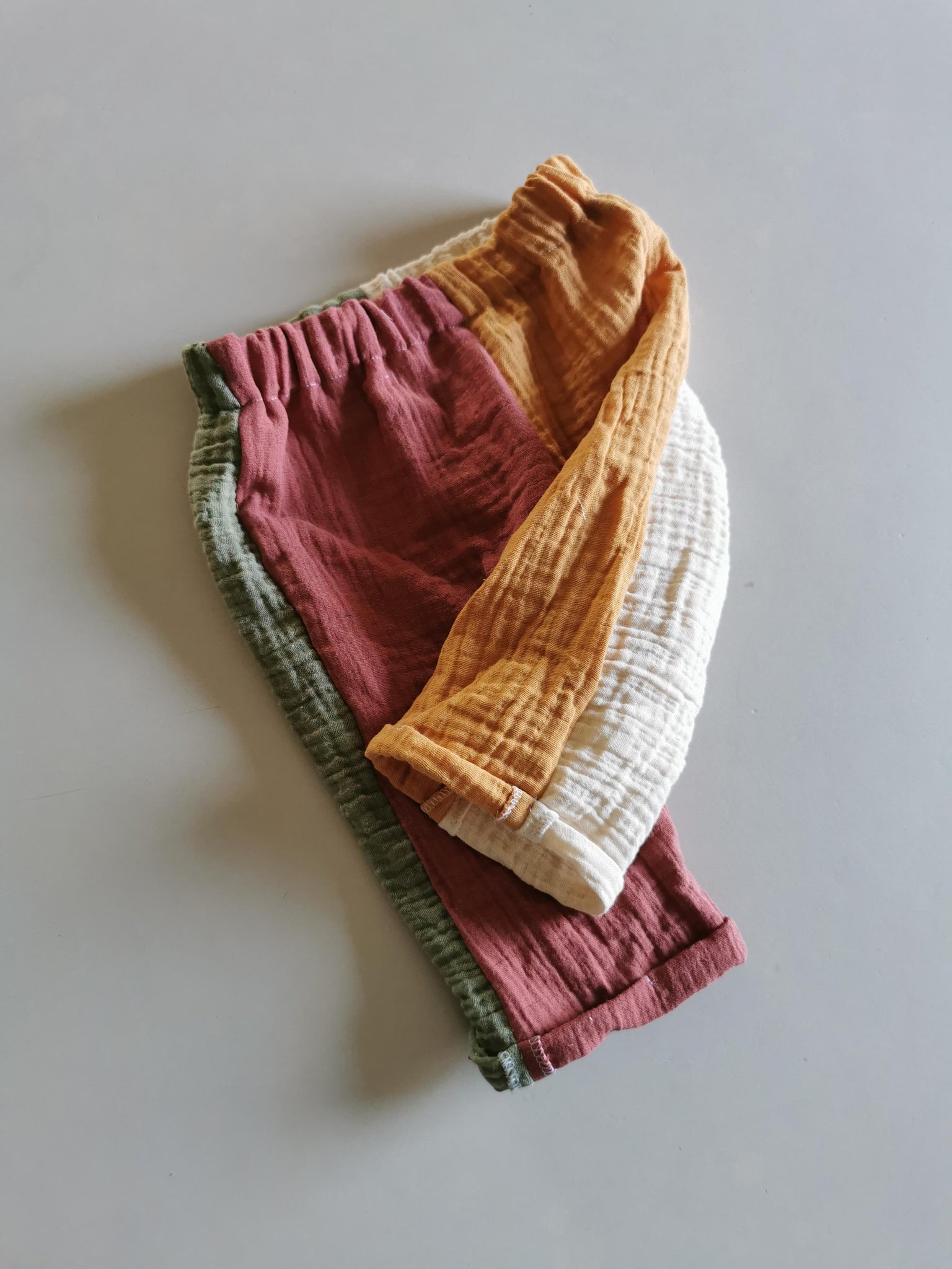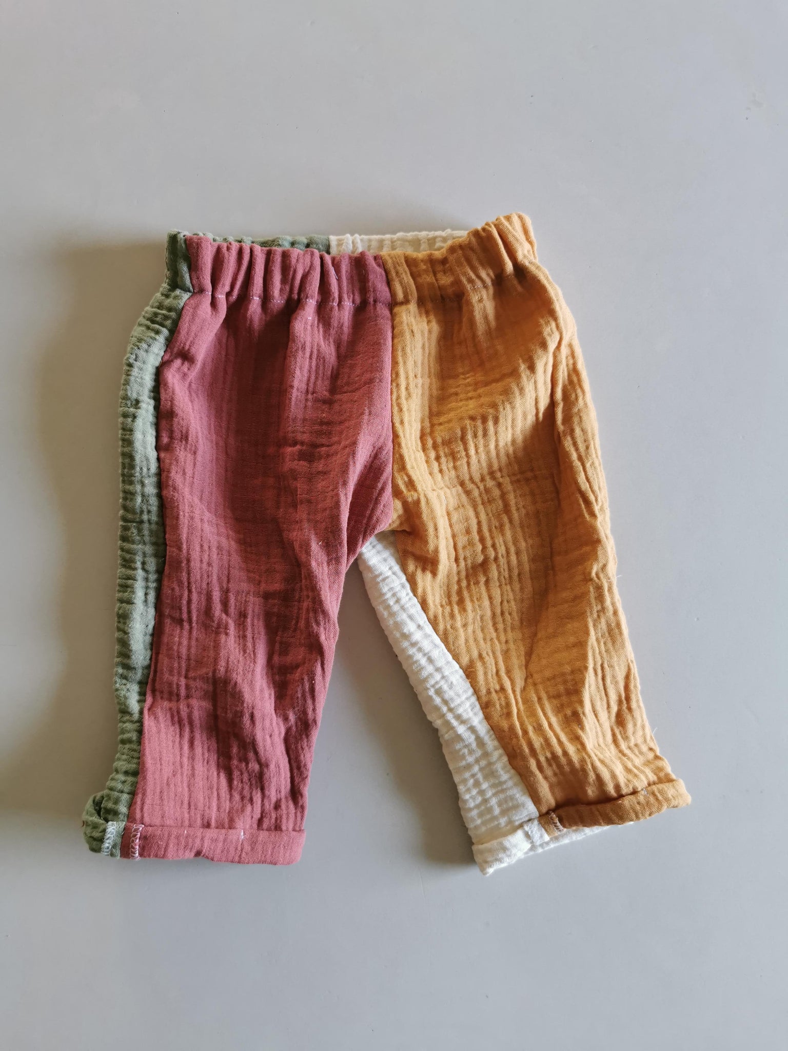 Lette og luftige bukser til børn, syet i fire forskellige slags lækker, blødt musselin, så de to ben er forskellige.