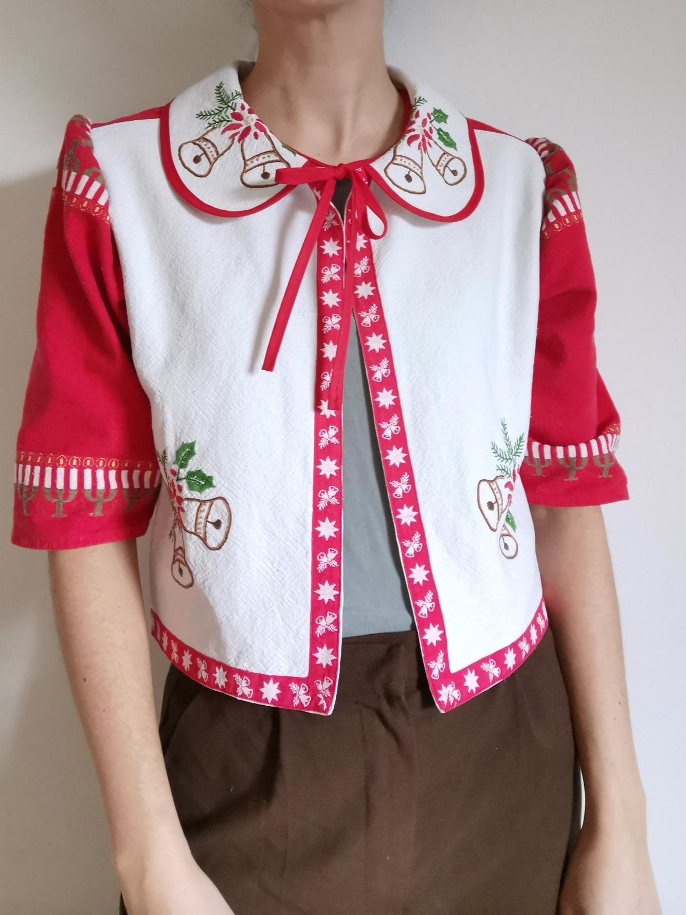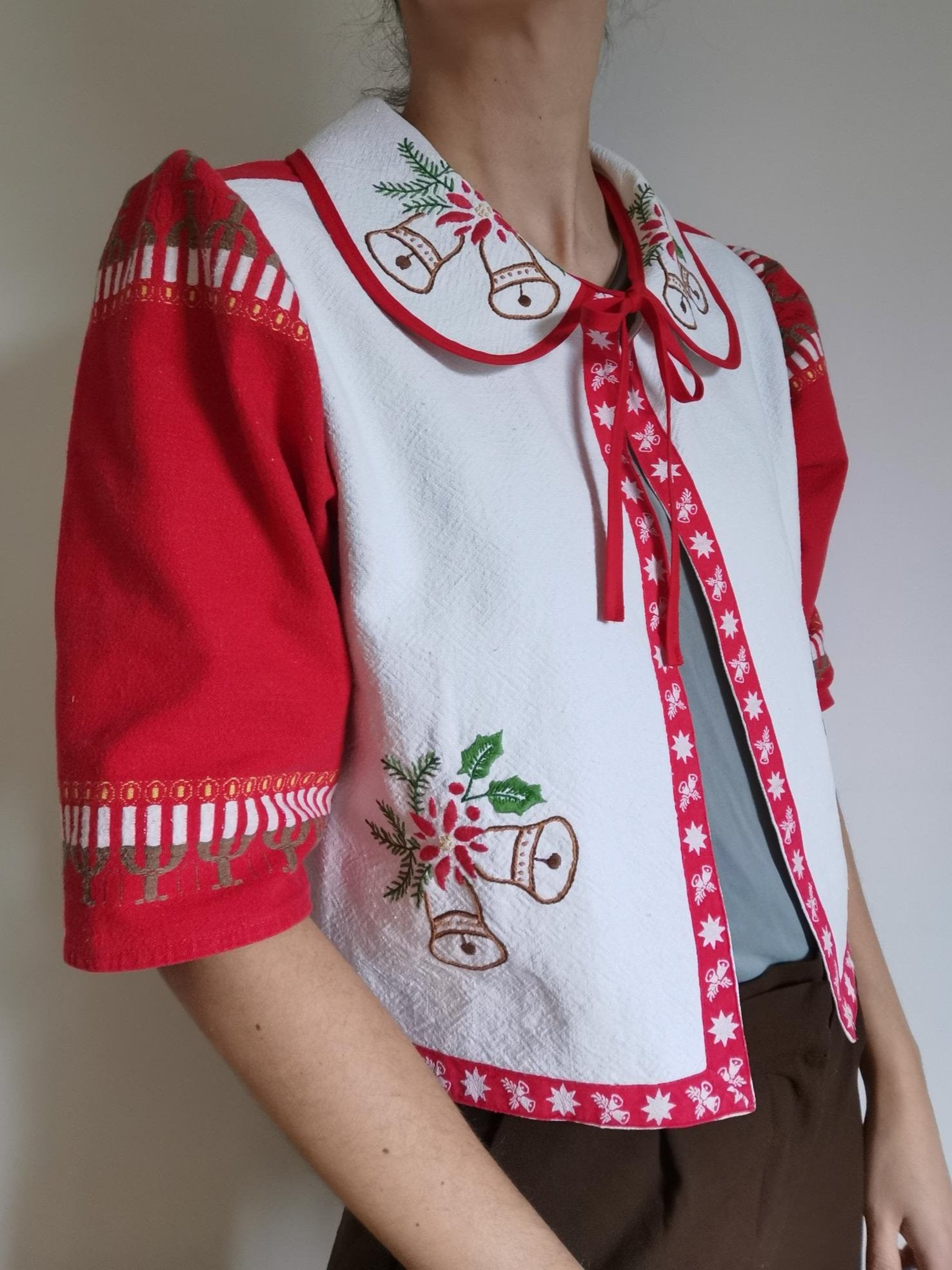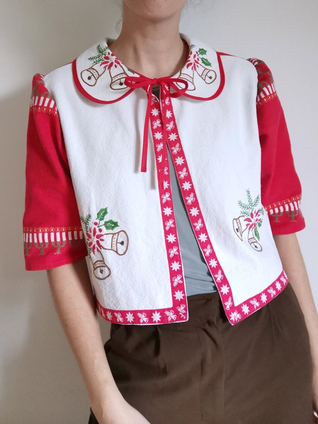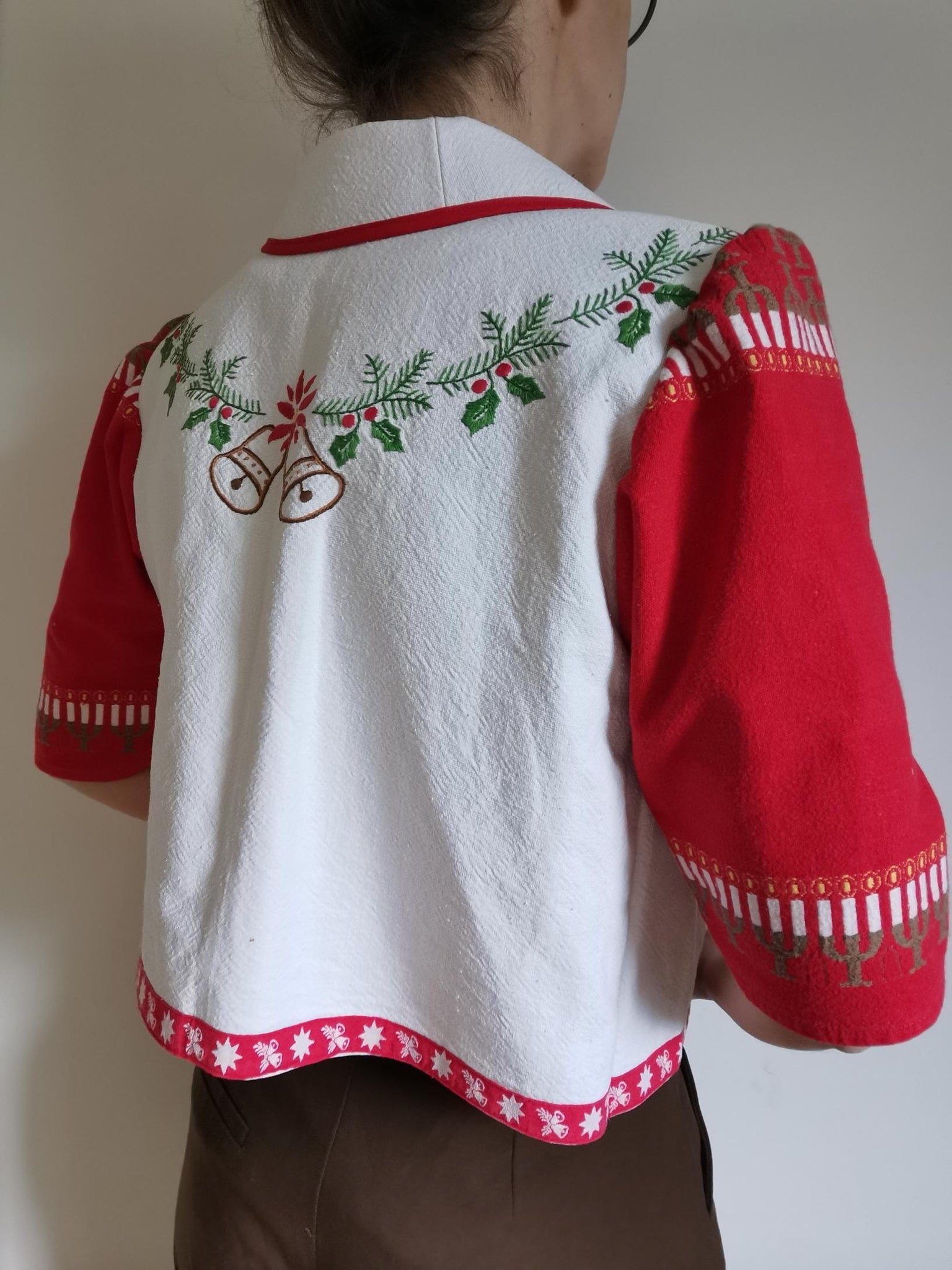 Unika sløjfe-bluse syet af vintagestof med julebroderier.