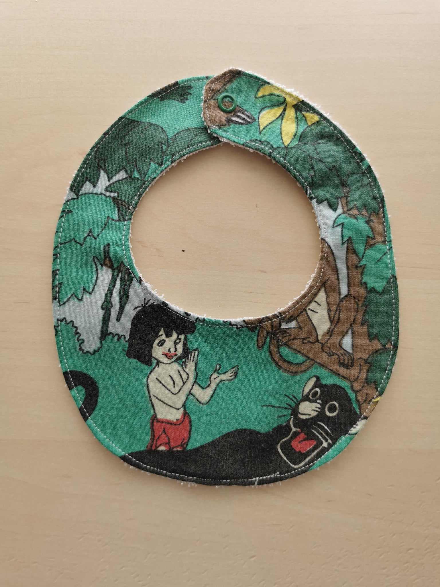 Savlesmæk syet af genbrugsstof i fine farver, med det skønneste retro børneprint på en grøn baggrund.