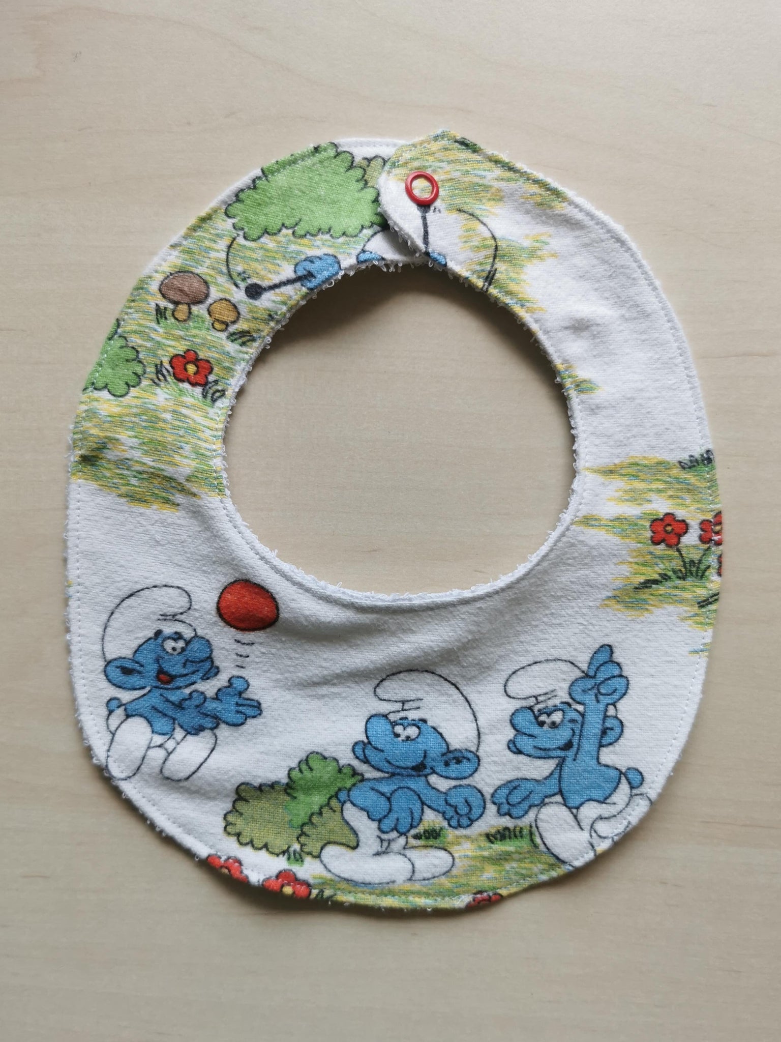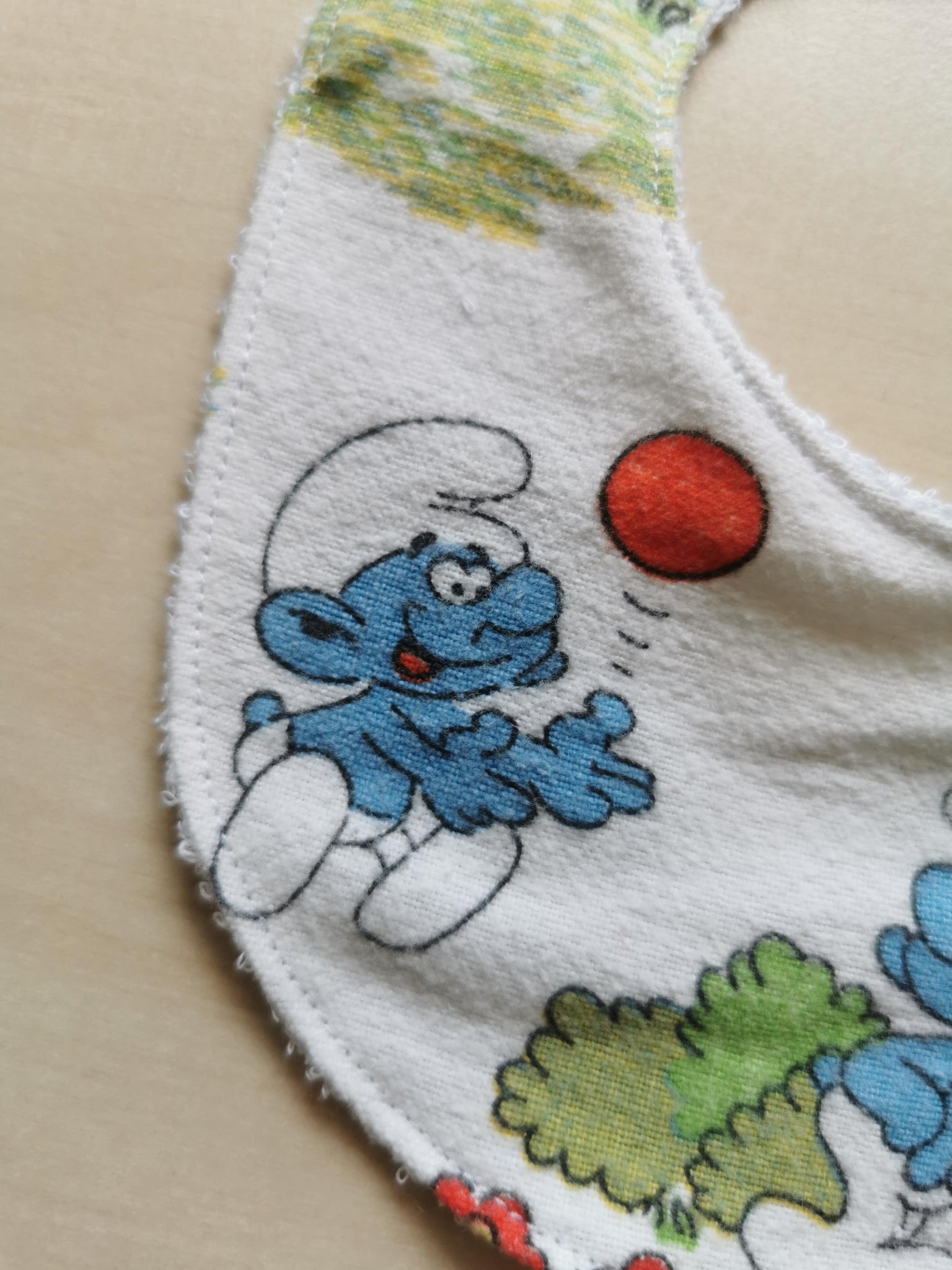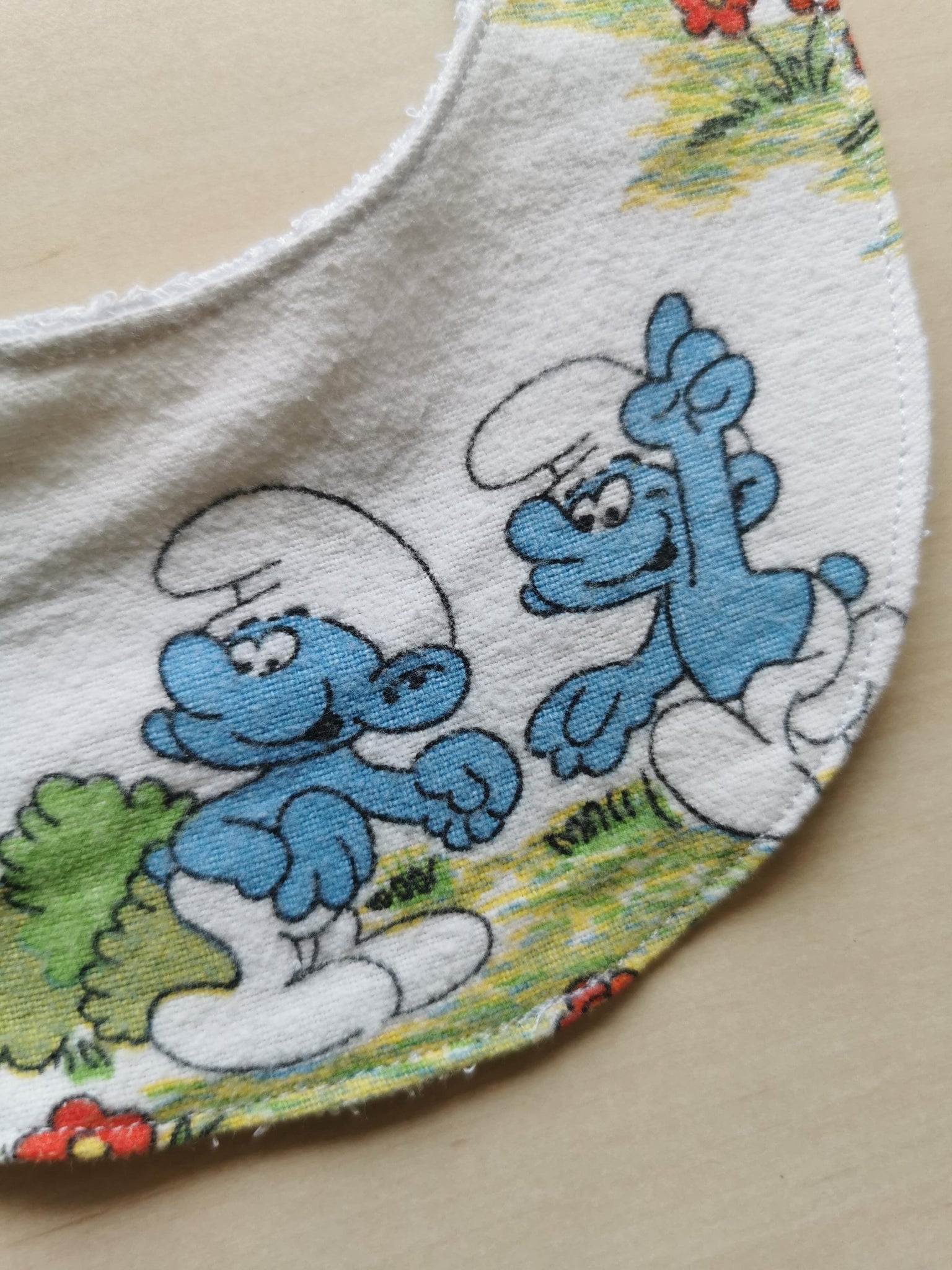 Savlesmæk syet af genbrugsstof i fine farver, med det skønneste retro "Smølferne" print på en hvid baggrund.
