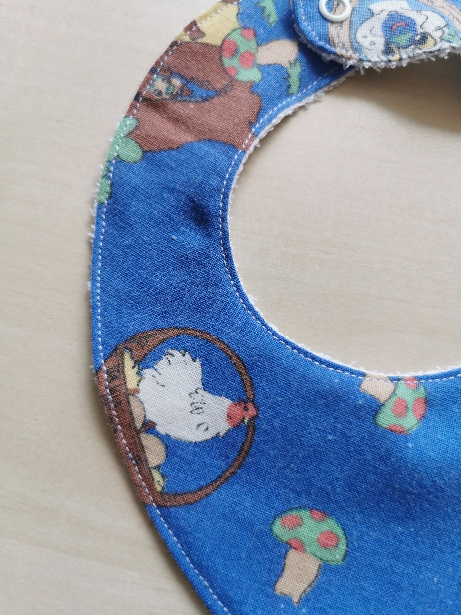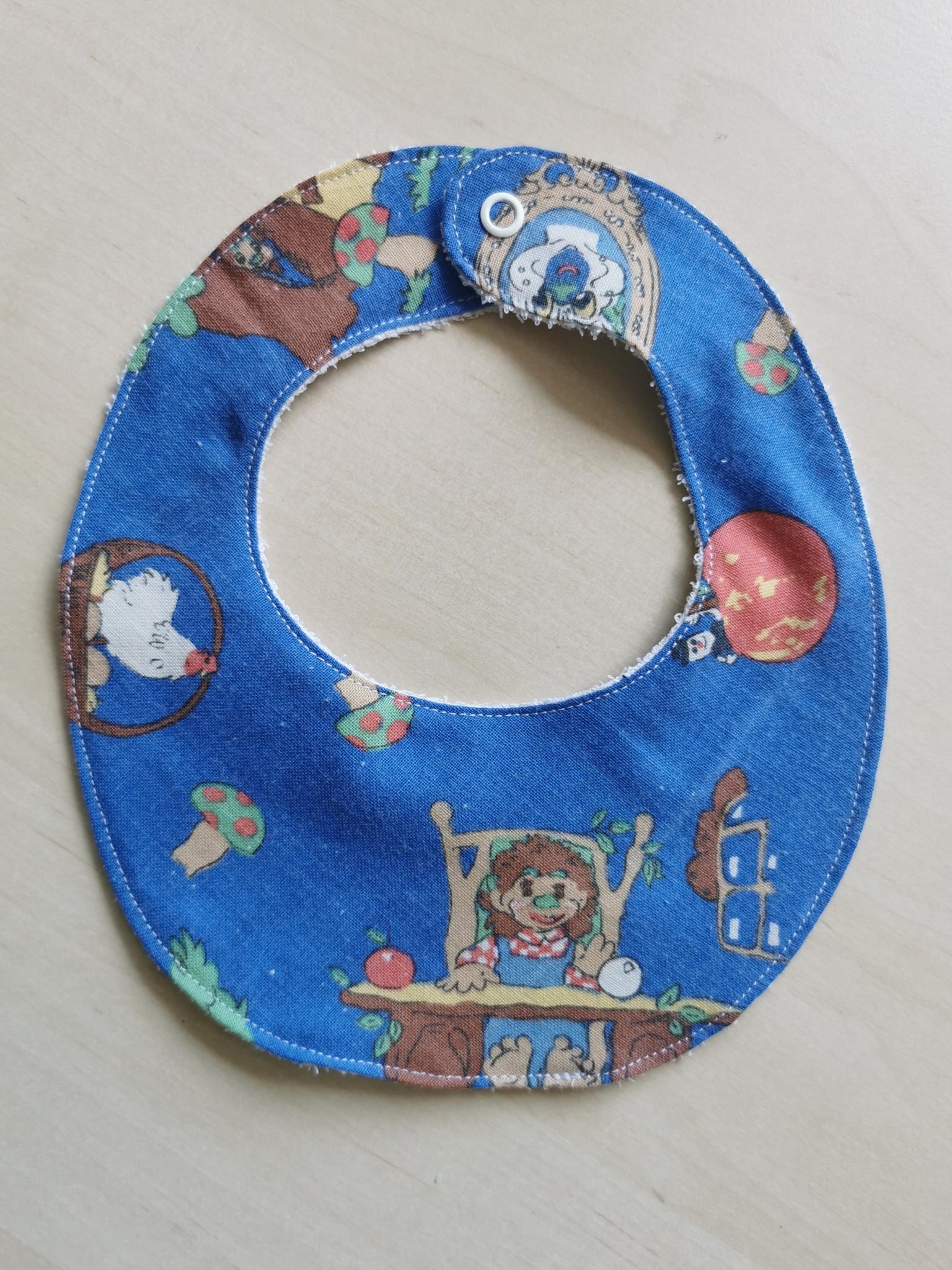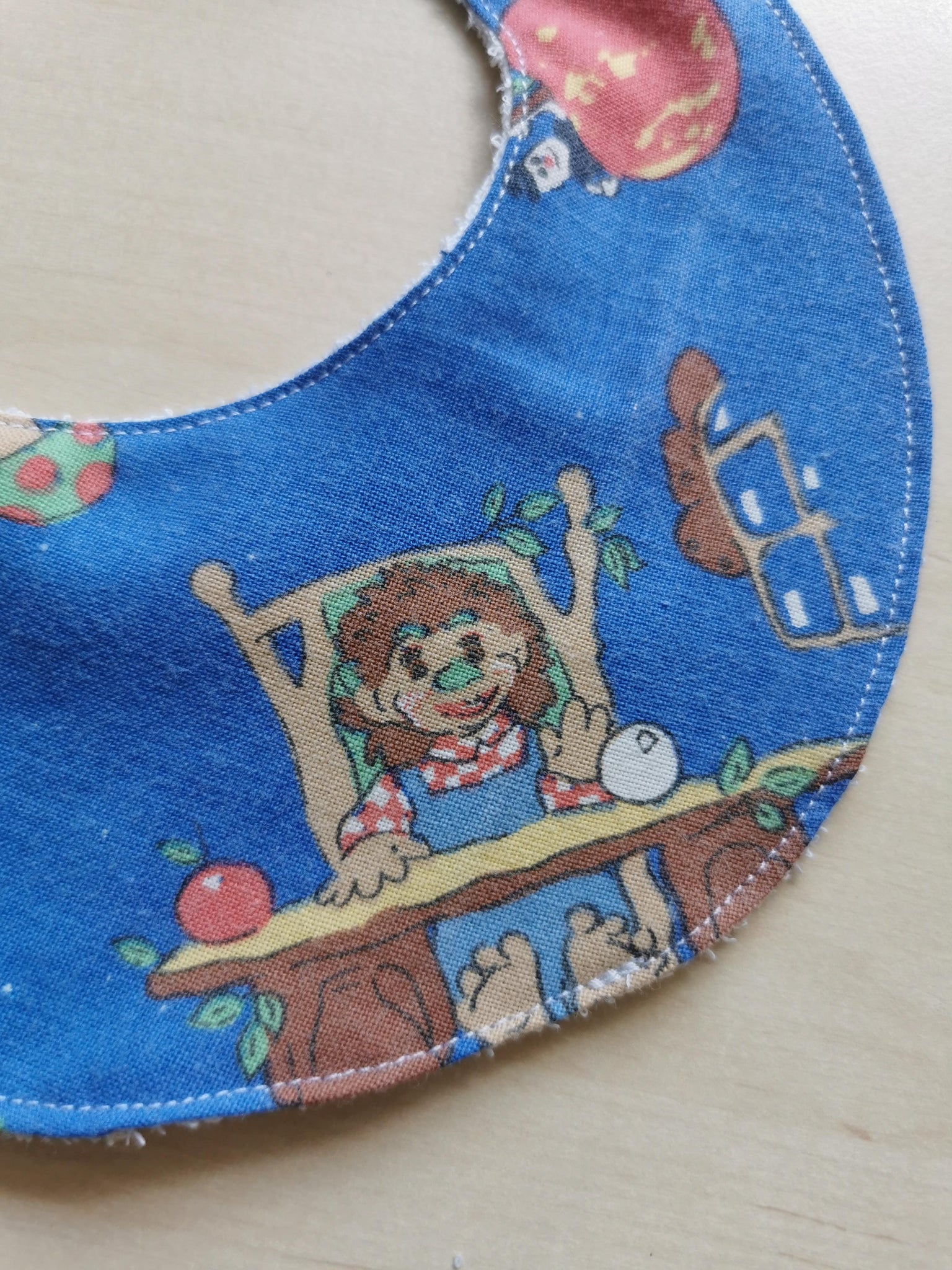 Savlesmæk syet af genbrugsstof i fine farver, med det skønneste retro Barbapapa print på en hvid baggrund.