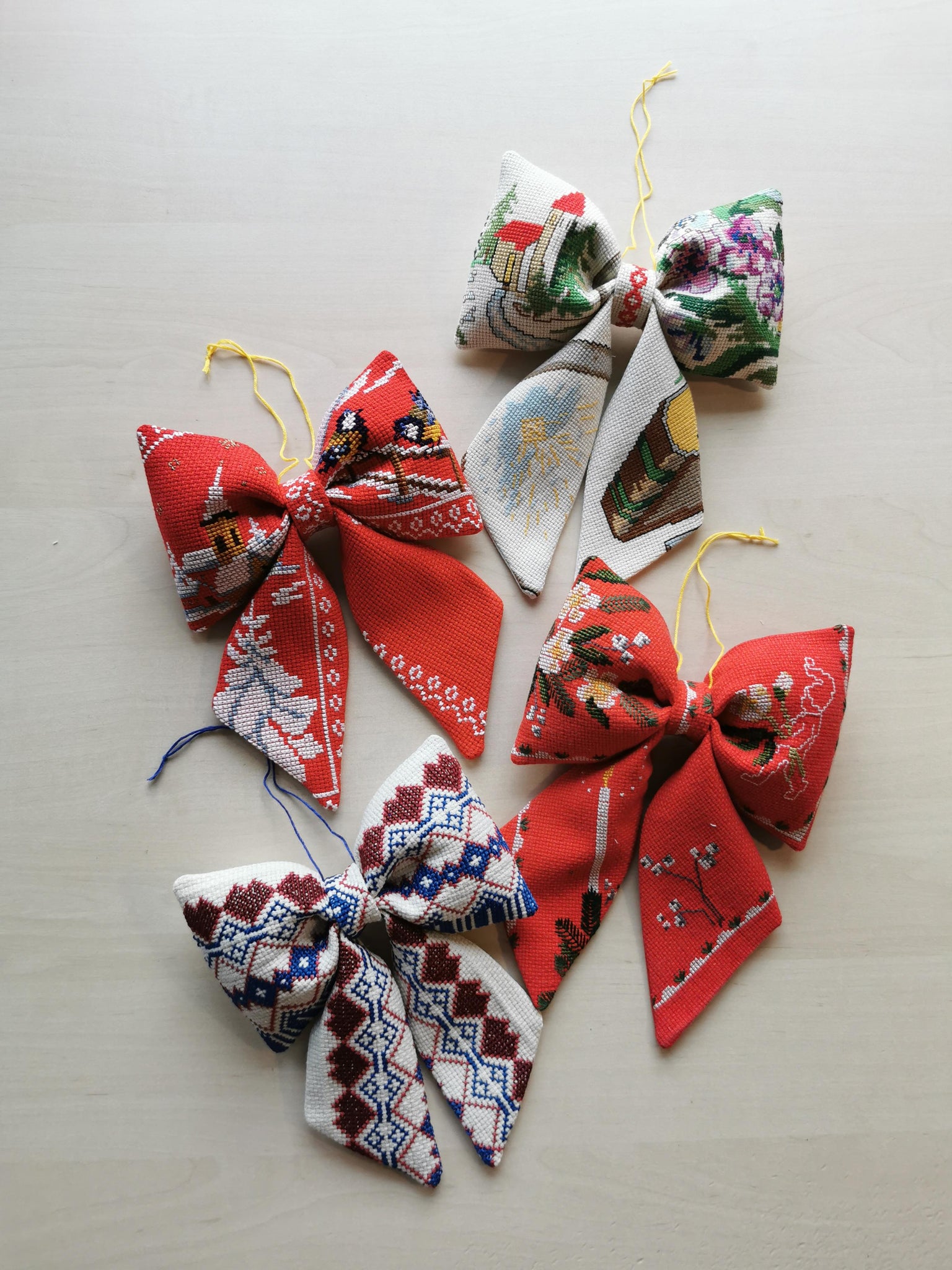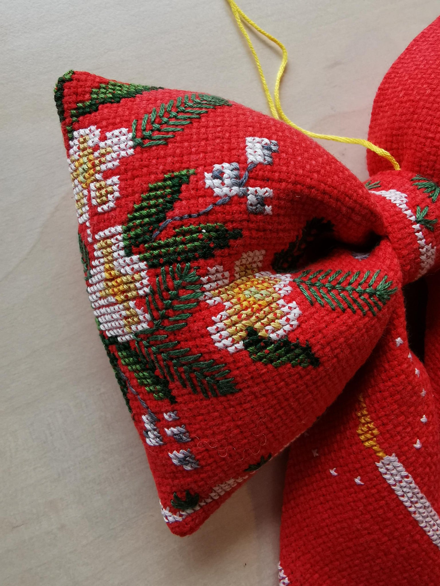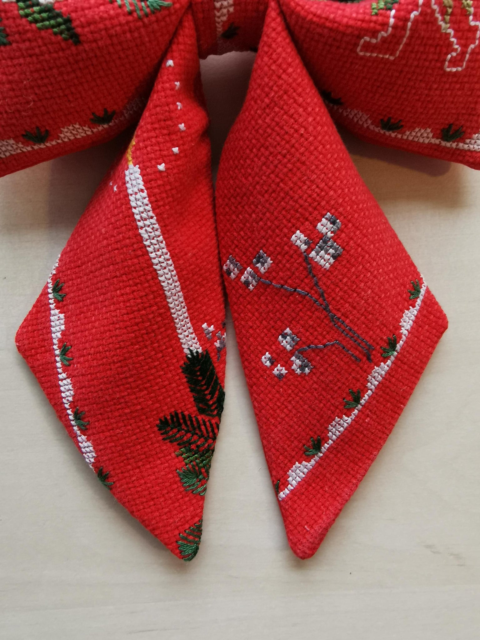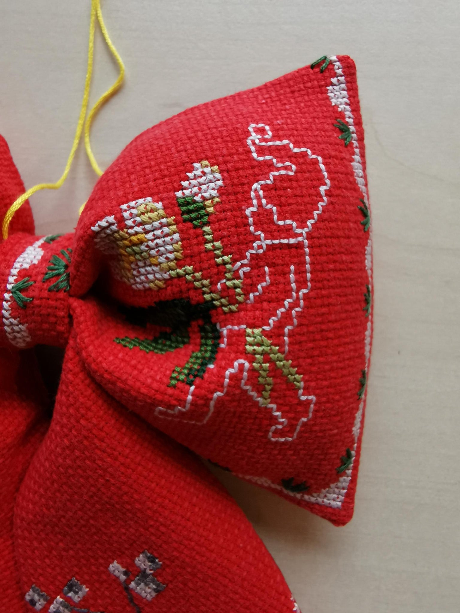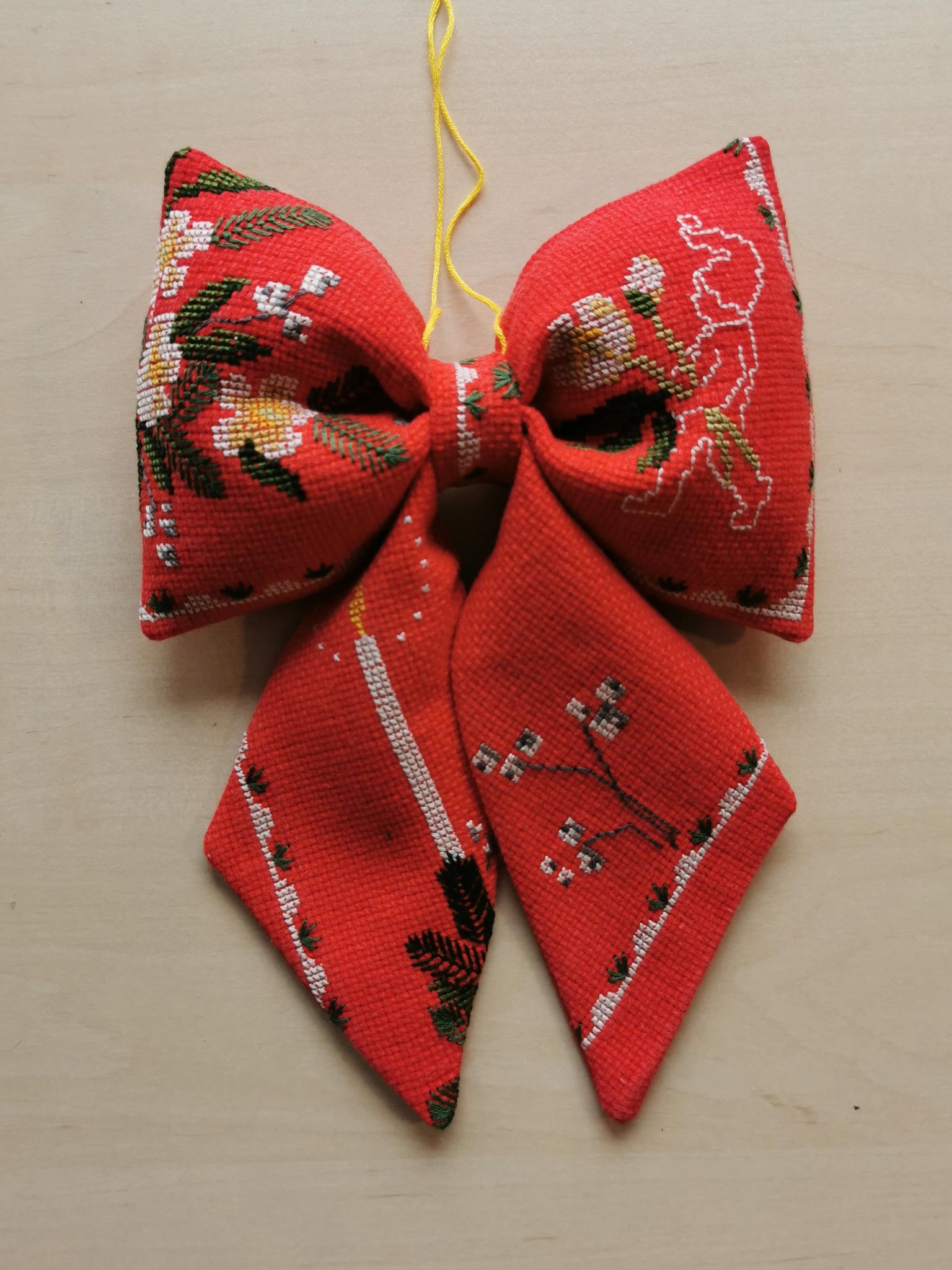 En fin sløjfe til ophæng syet af af detaljeret broderet vintagestof. Baggrundsfarven er julerød, med fine broderier på.