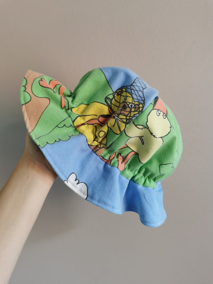 Mønster samt udførlig billedvejledning til at sy en sommerhat til børn i størrelserne 0-6 år.
