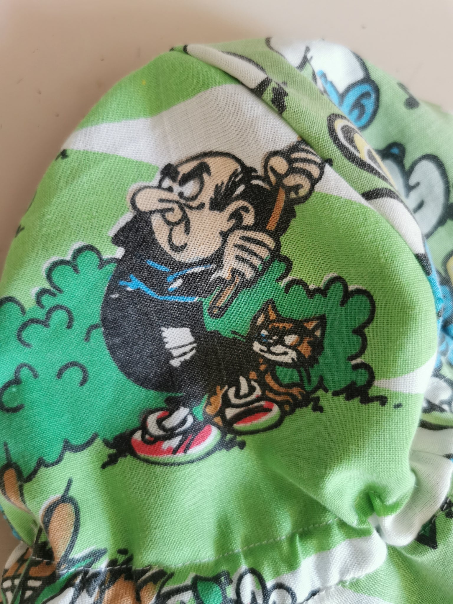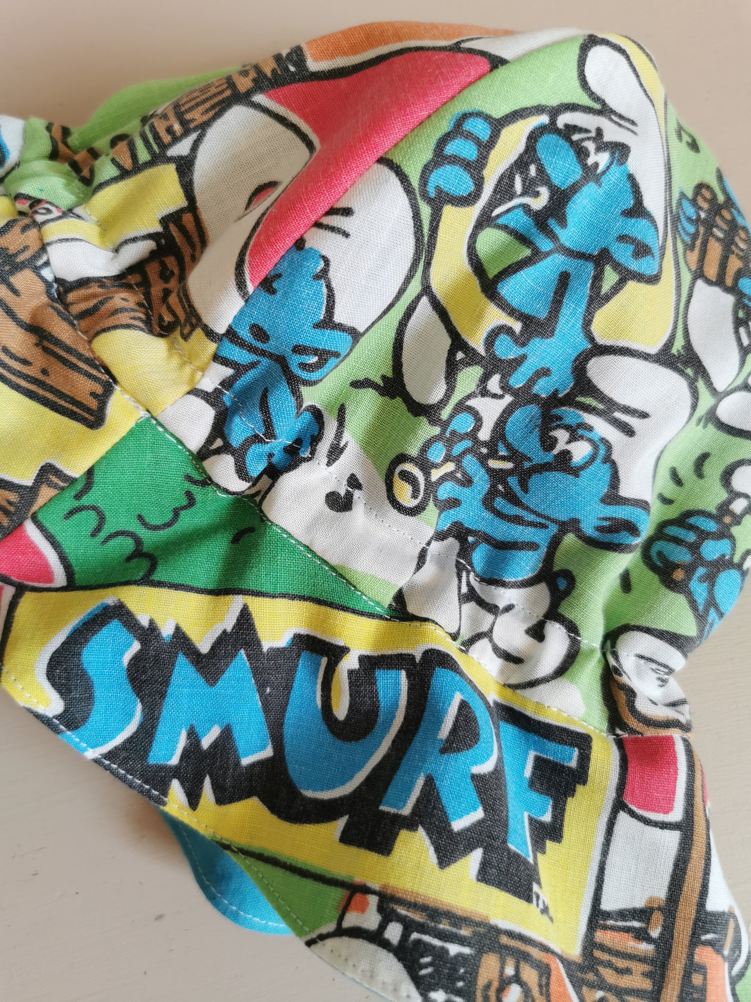 Sommerhat syet af genbrugsstof med retro motiv af smølferne