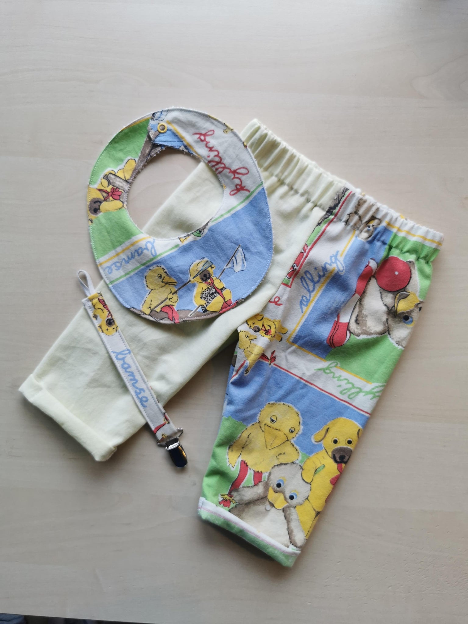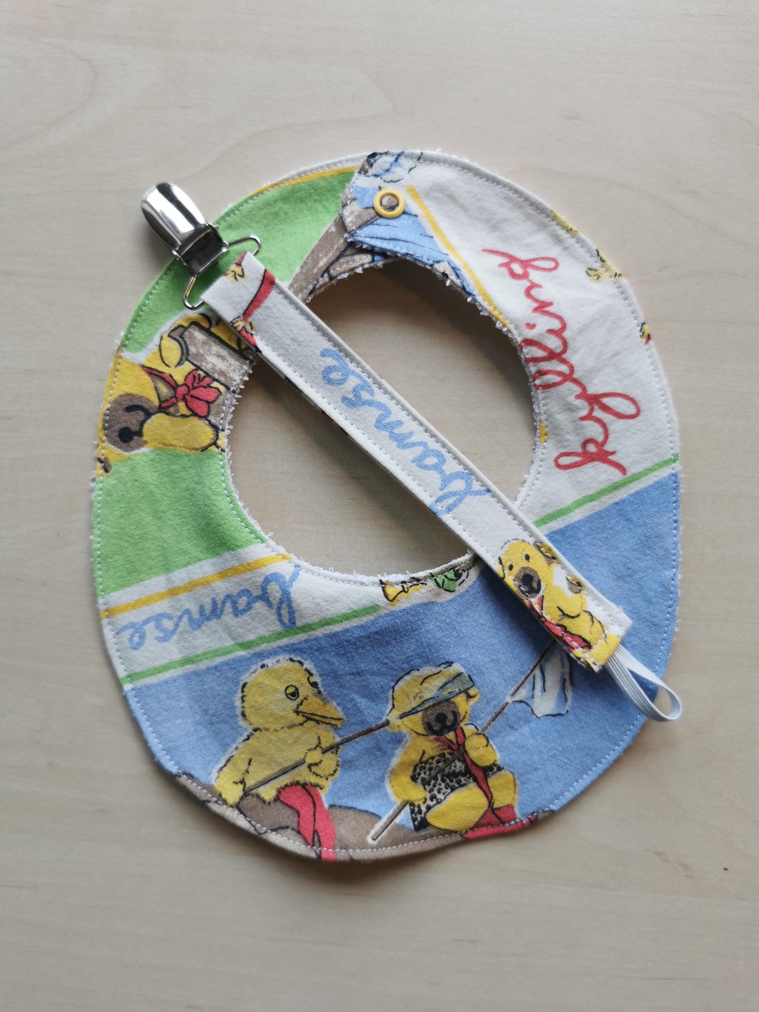 Suttesnor syet af genbrugsstof med retro Bamse og Kylling print.