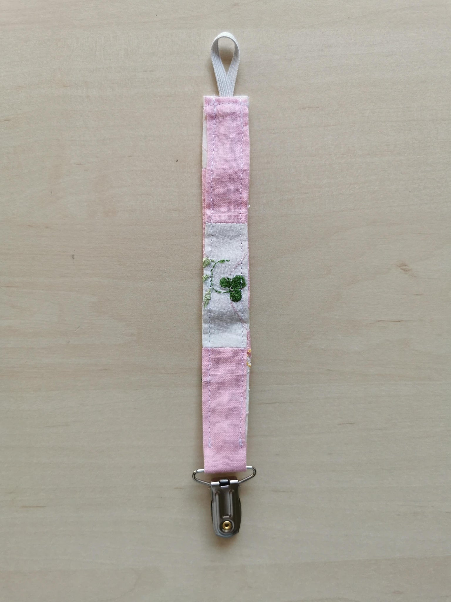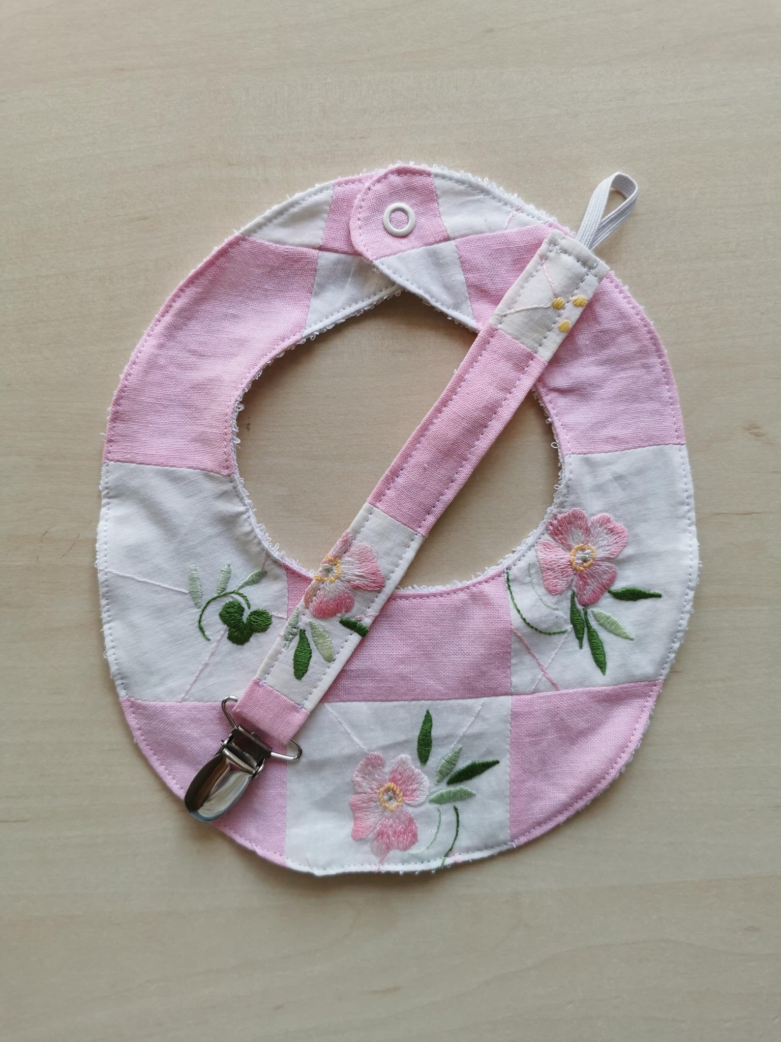 Suttesnor syet i et patchwork af genbrugsstof i lyserøde og hvide farver.