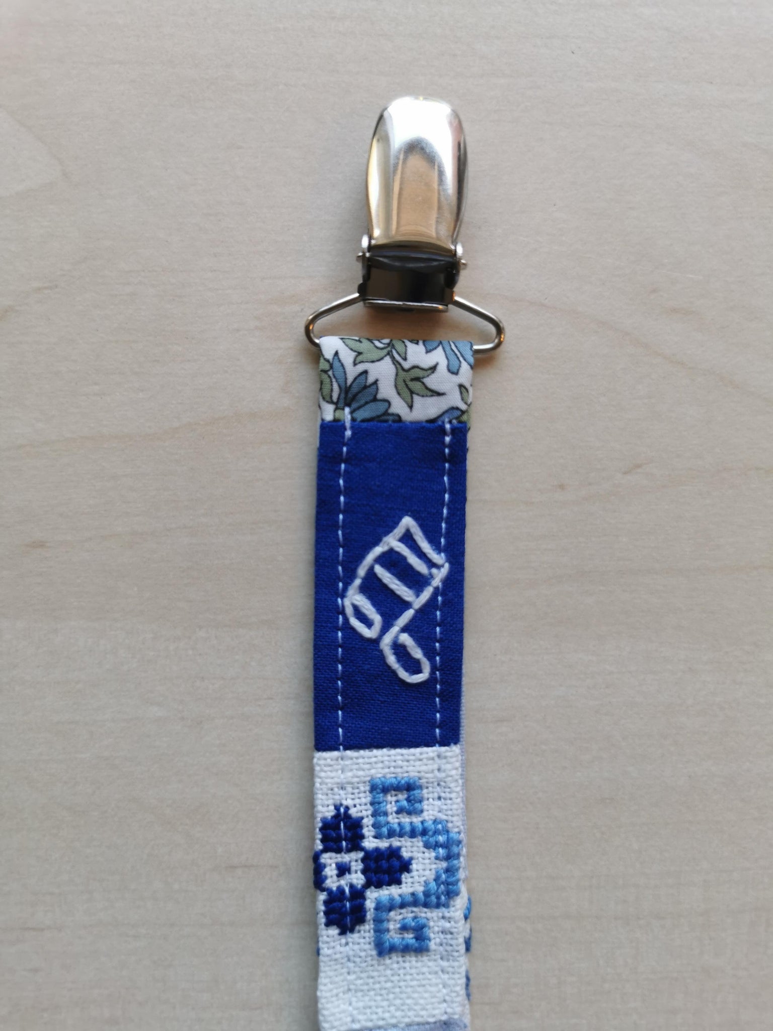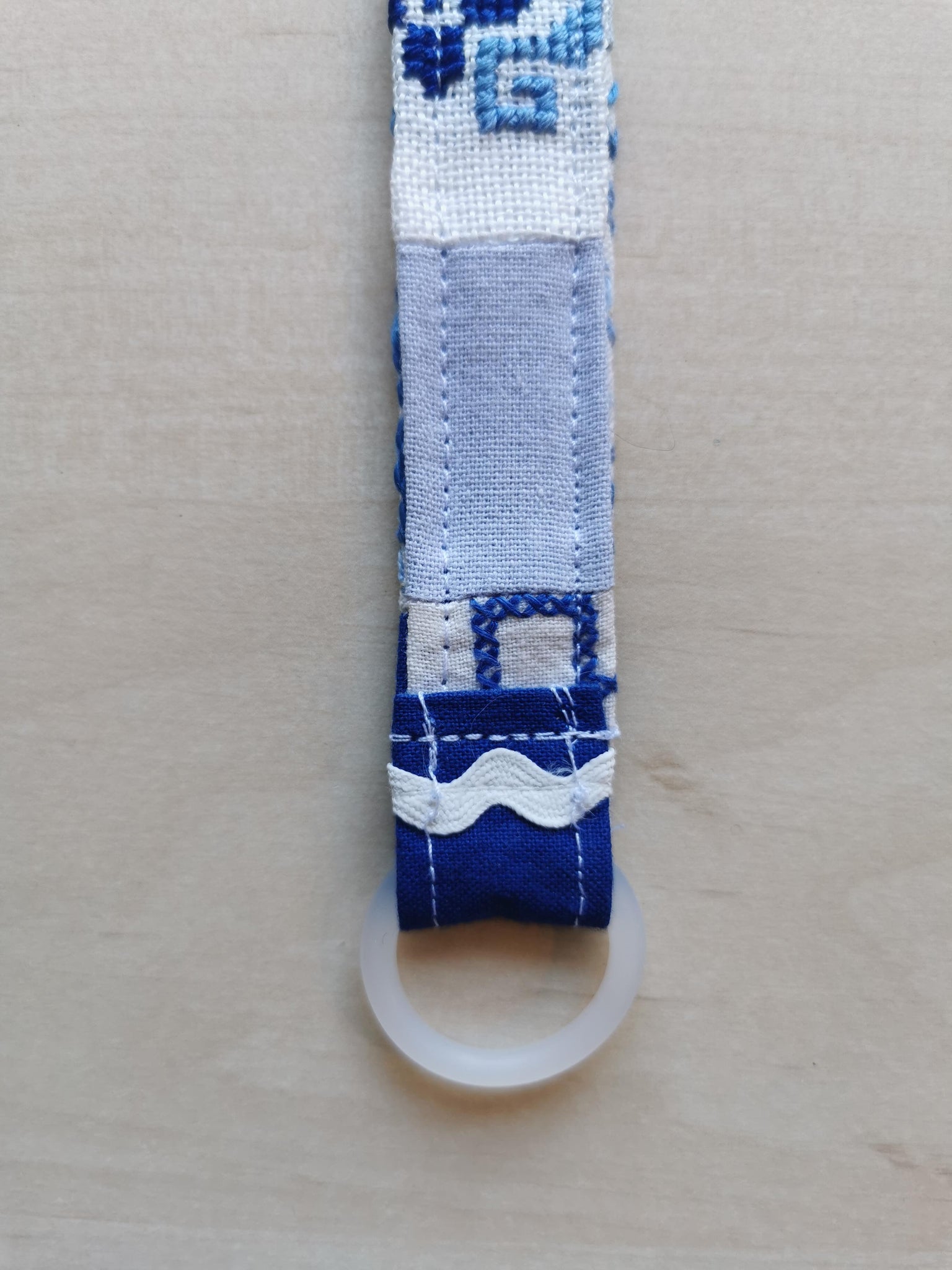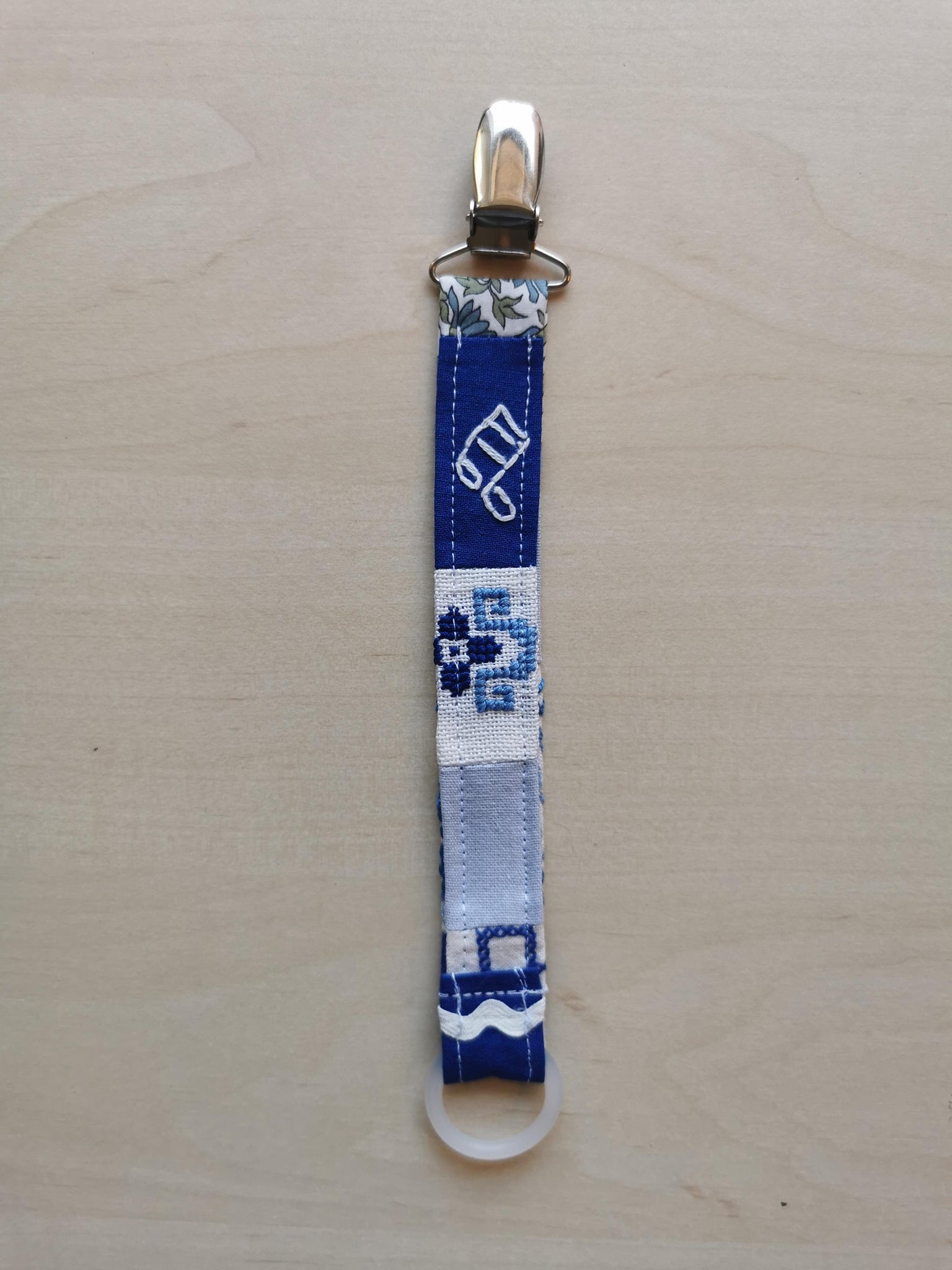 Suttesnor syet af i et patchwork af små stykker vintagestof med broderi - alle i blå fuancer.